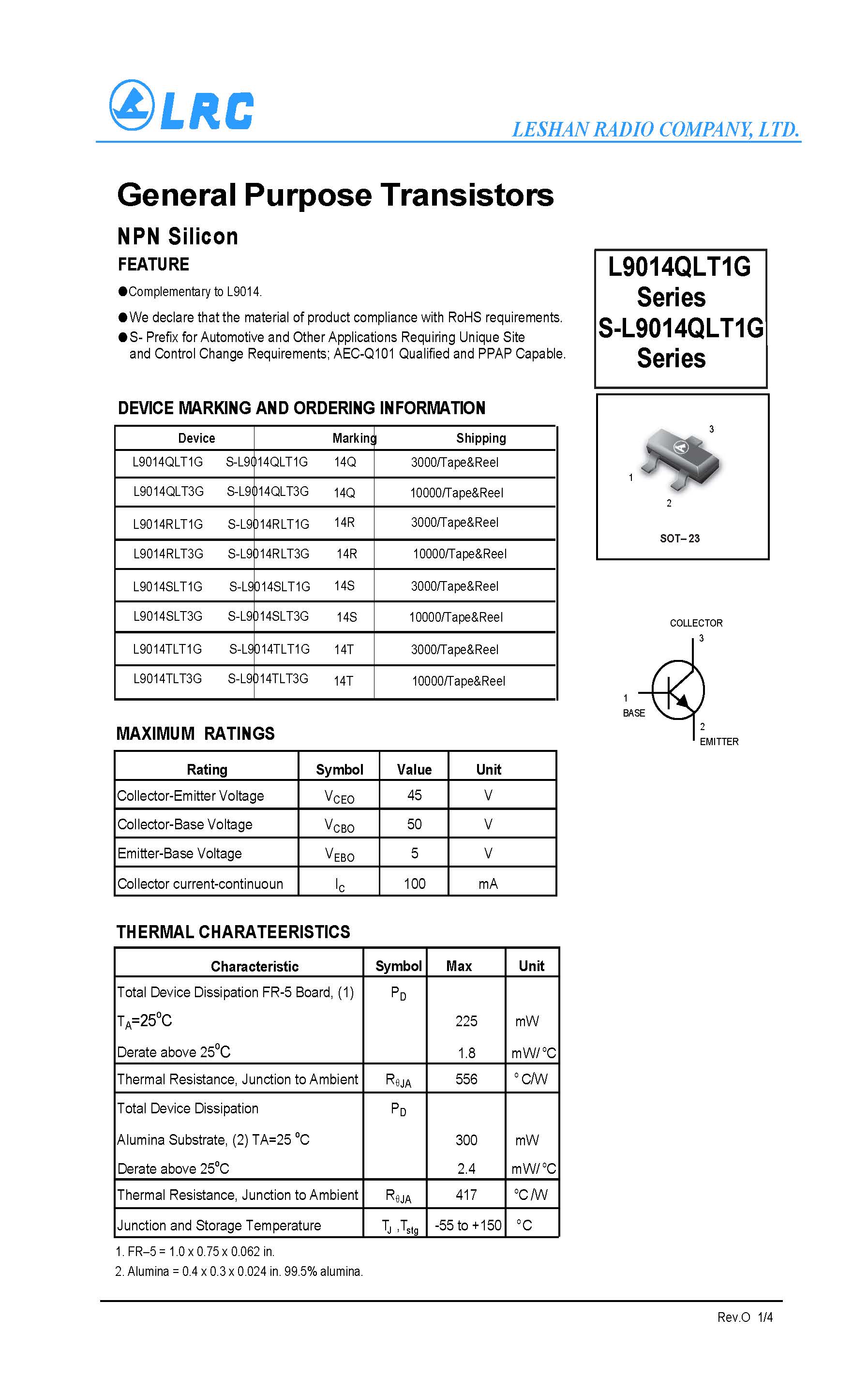 > L9014TLT1G SOT-23 NPN LRC三級管