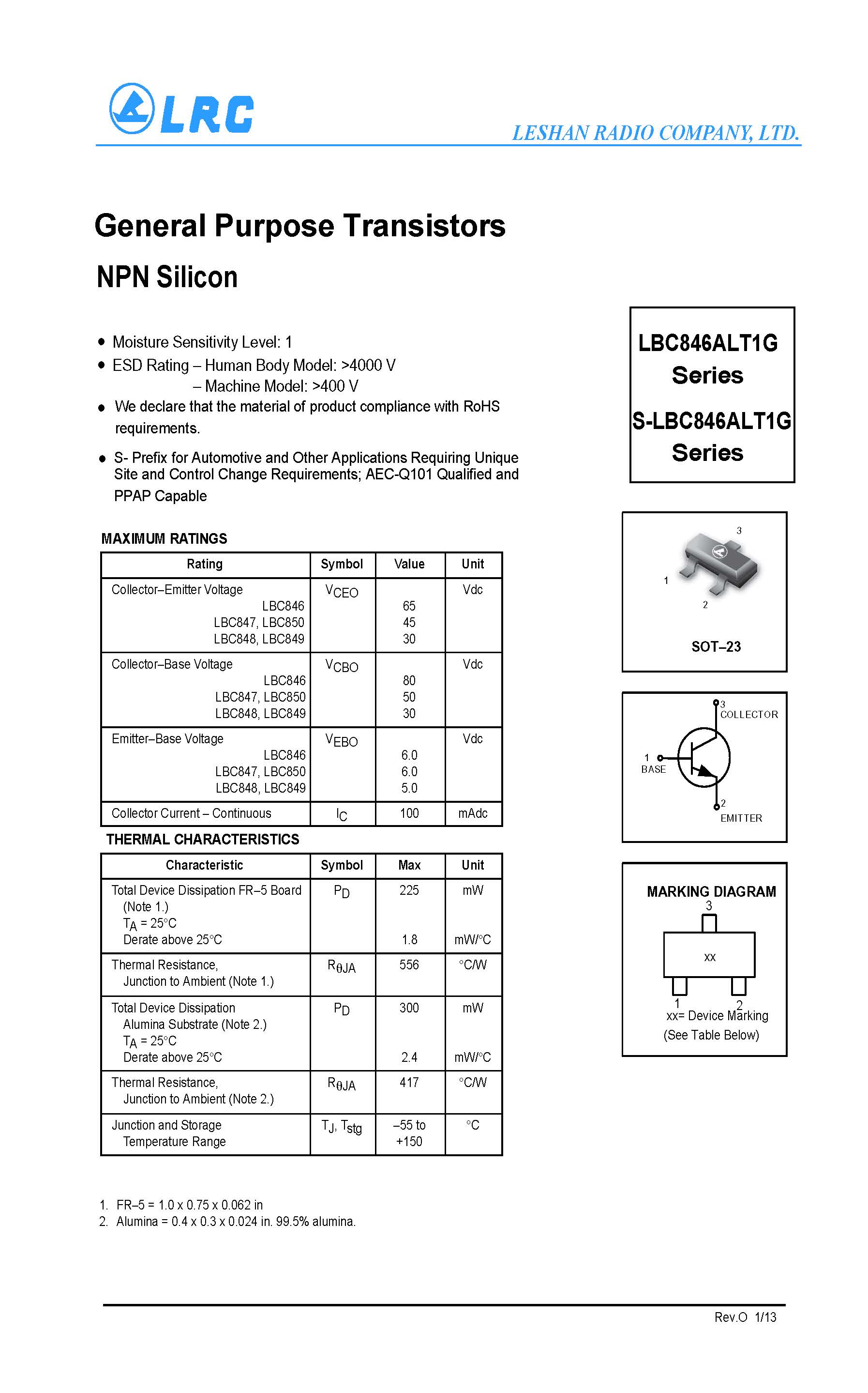 > LBC847ALT1G SOT-23 NPN LRC三級管
