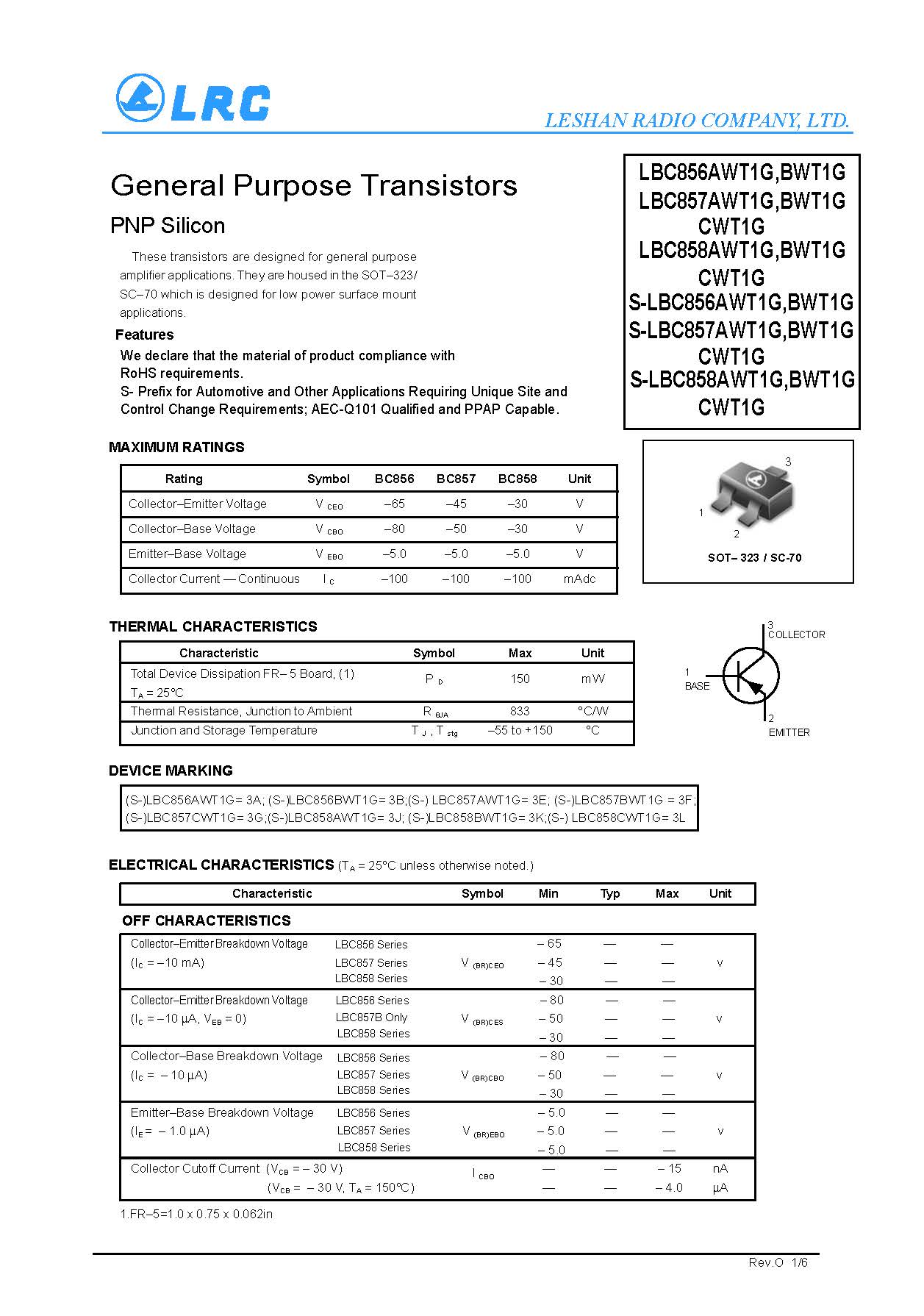 > LBC857BWT1G SC-70 PNP LRC三級管