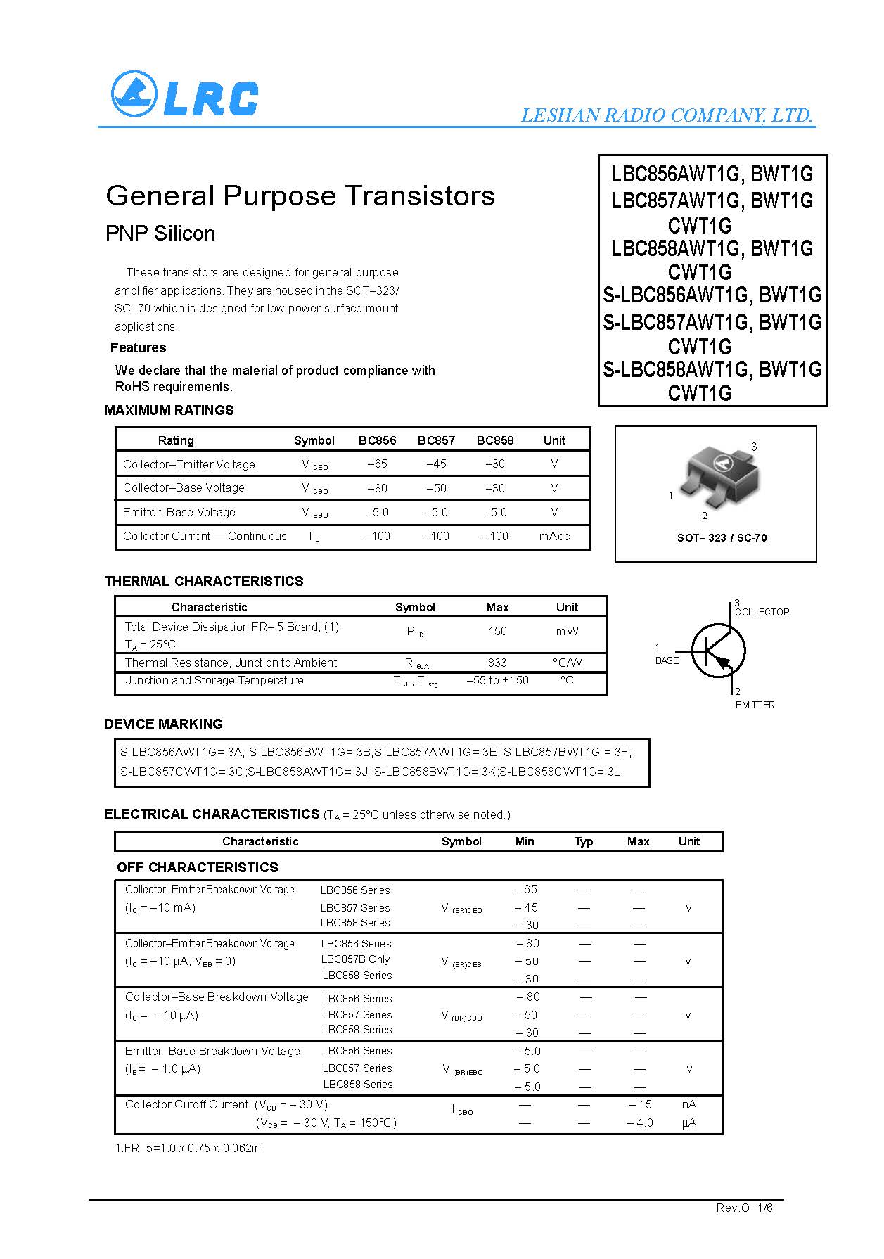 > LBC857CWT1G SC-70 PNP LRC三級管