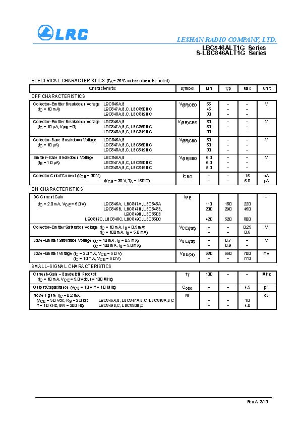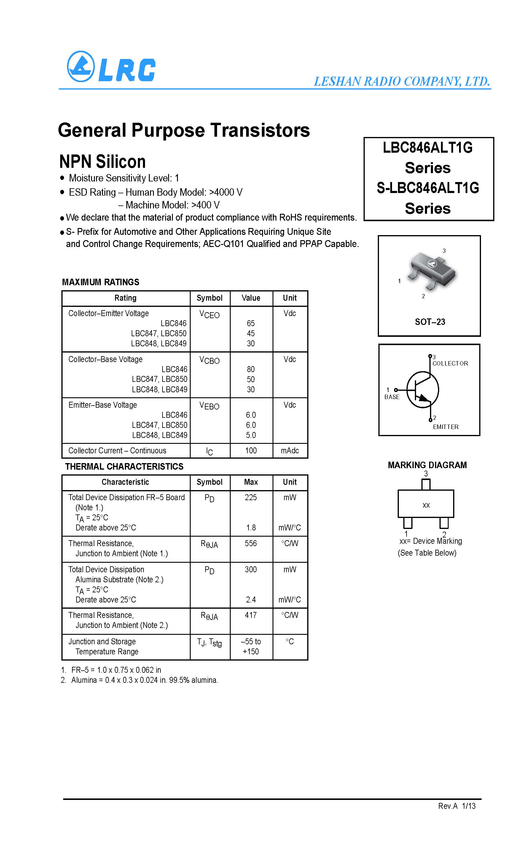 > LBC846ALT1G SOT-23 NPN LRC三級管