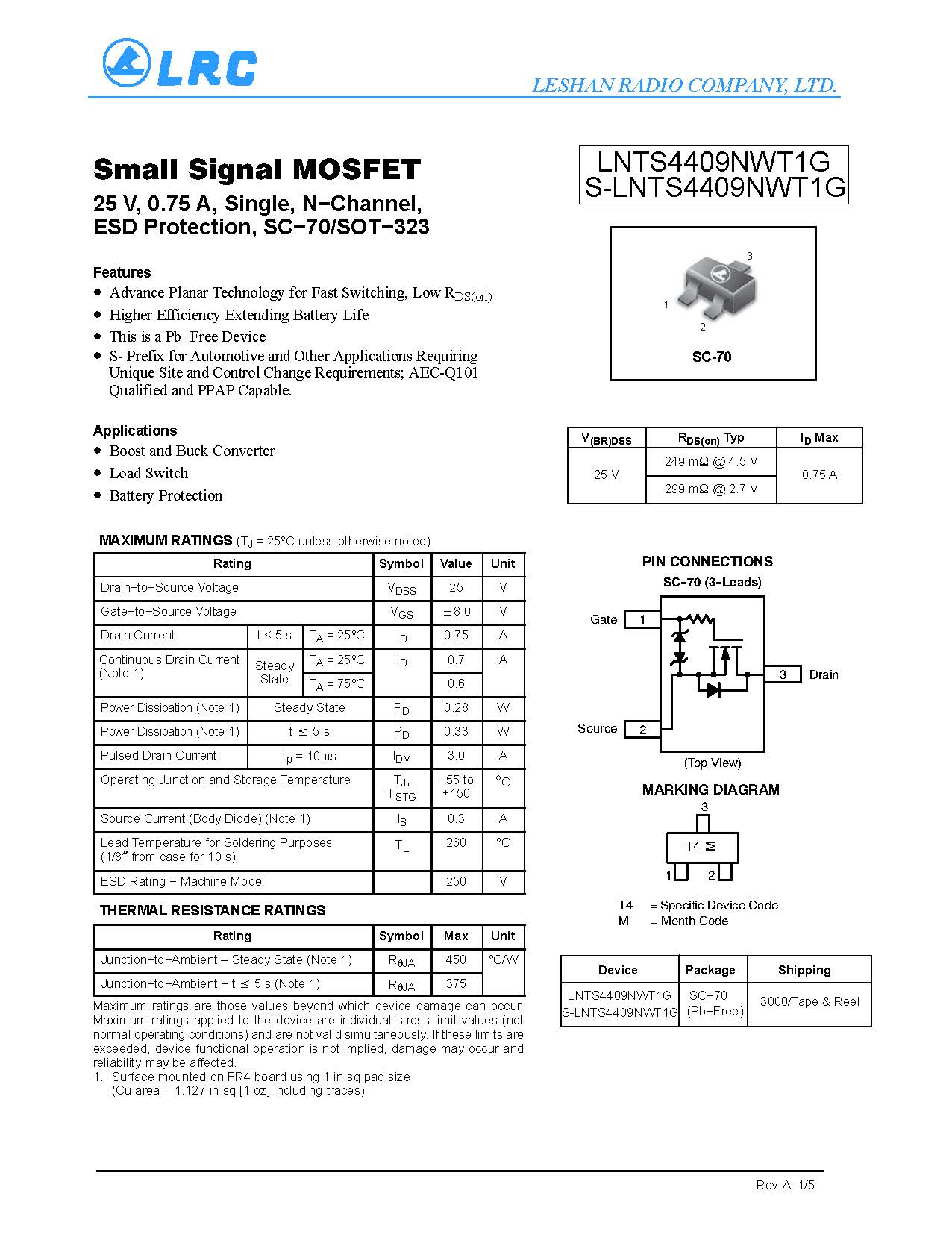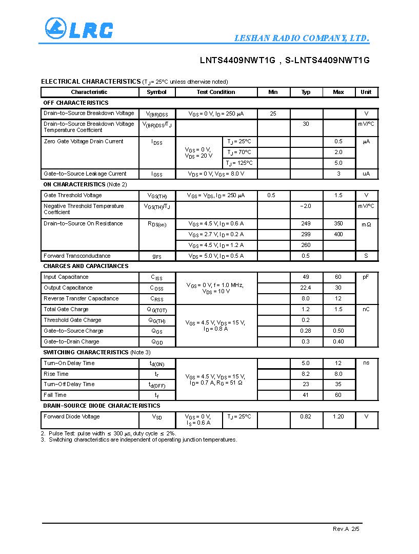 LNTS4409NWT1G SC-70 LRC MOS管