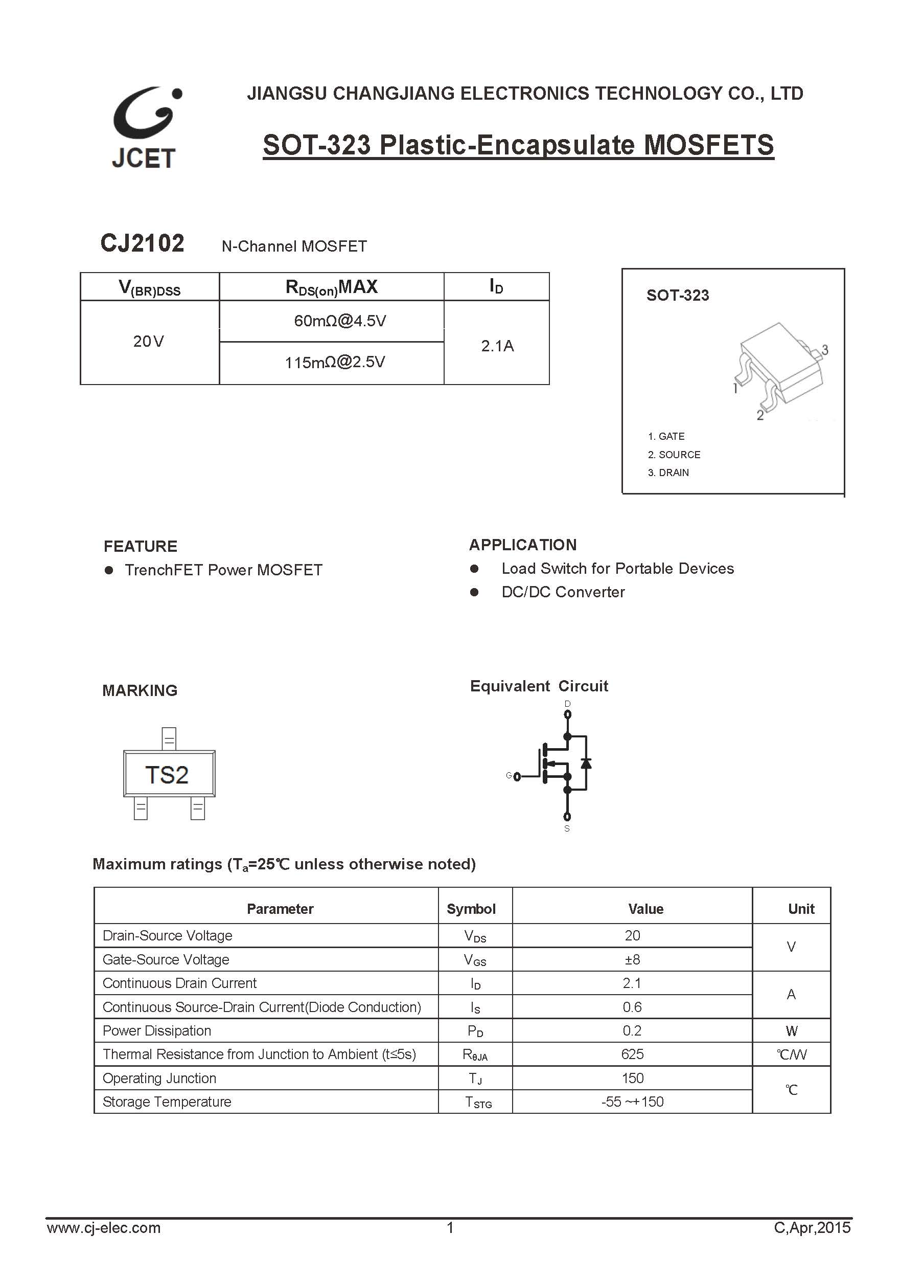 CJ2102 N-ch MOS管 SOT-323 長電
