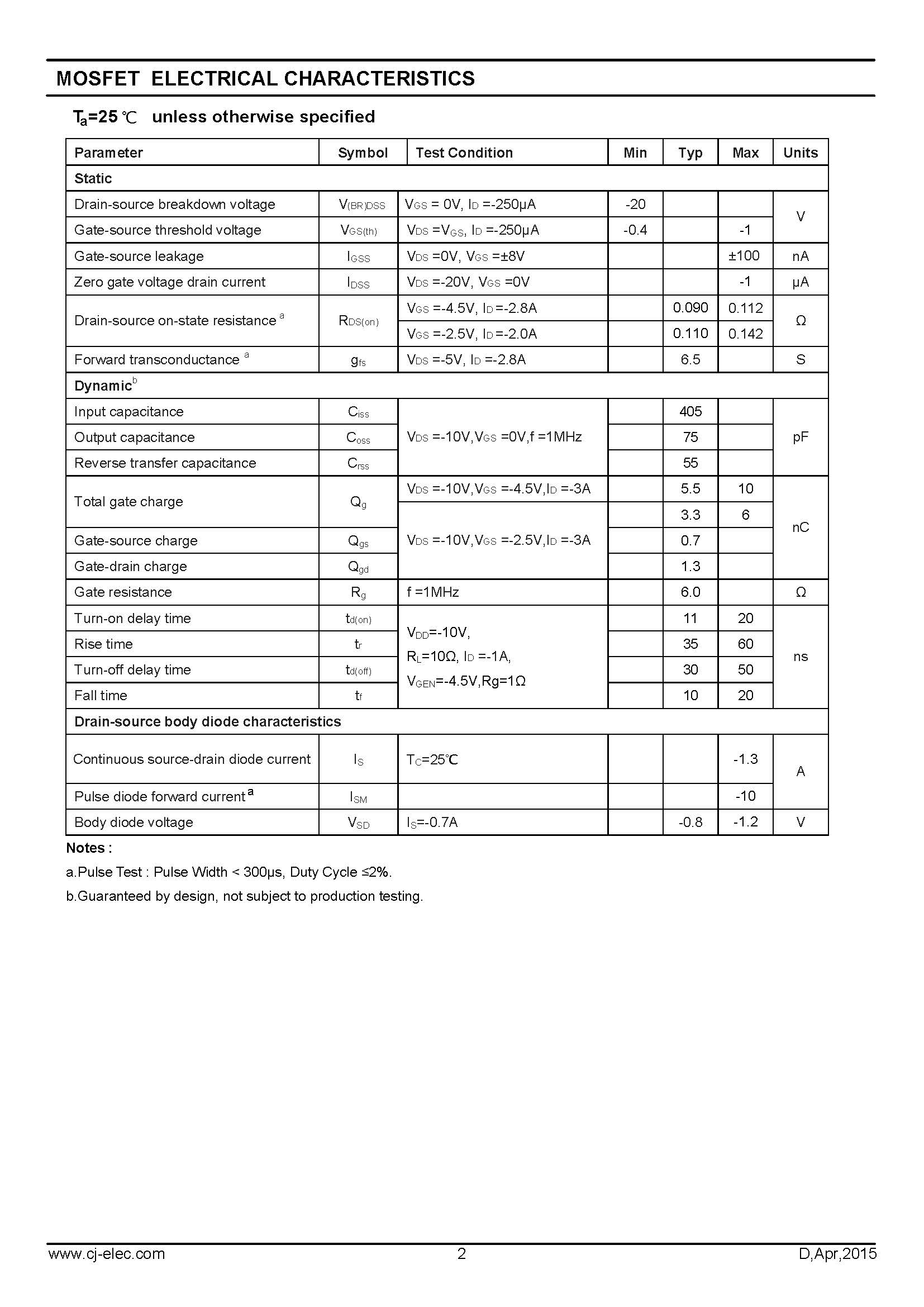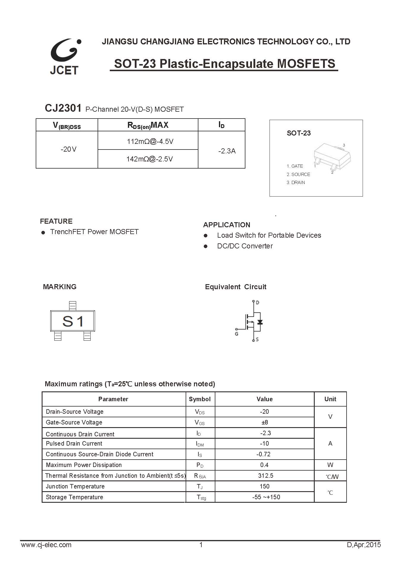 > CJ2301 P-ch MOS管 SOT-23 長電