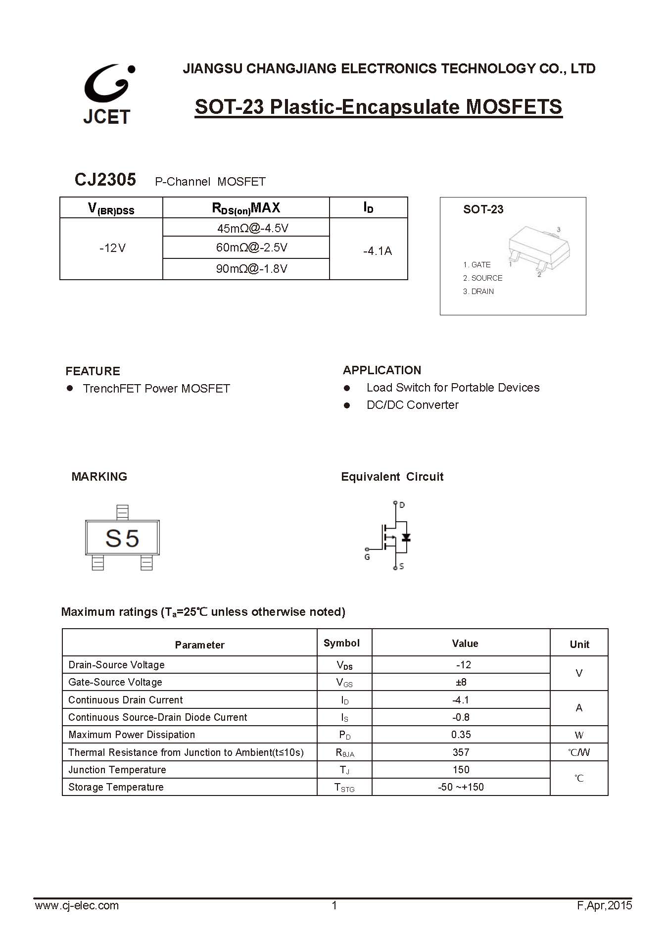 > CJ2305 P-ch MOS管 SOT-23 長電