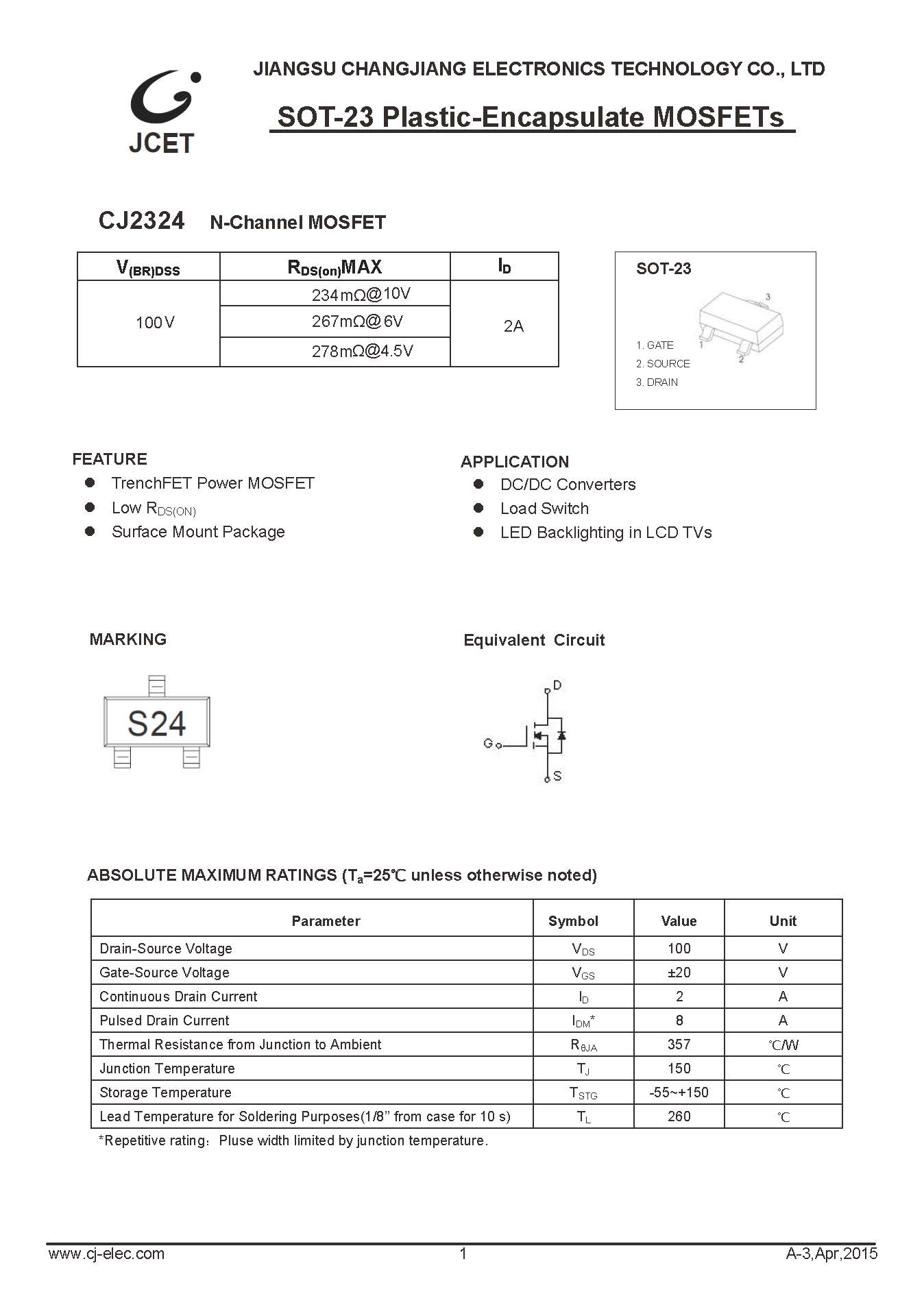 > CJ2324* N-ch MOS管 SOT-23 長電