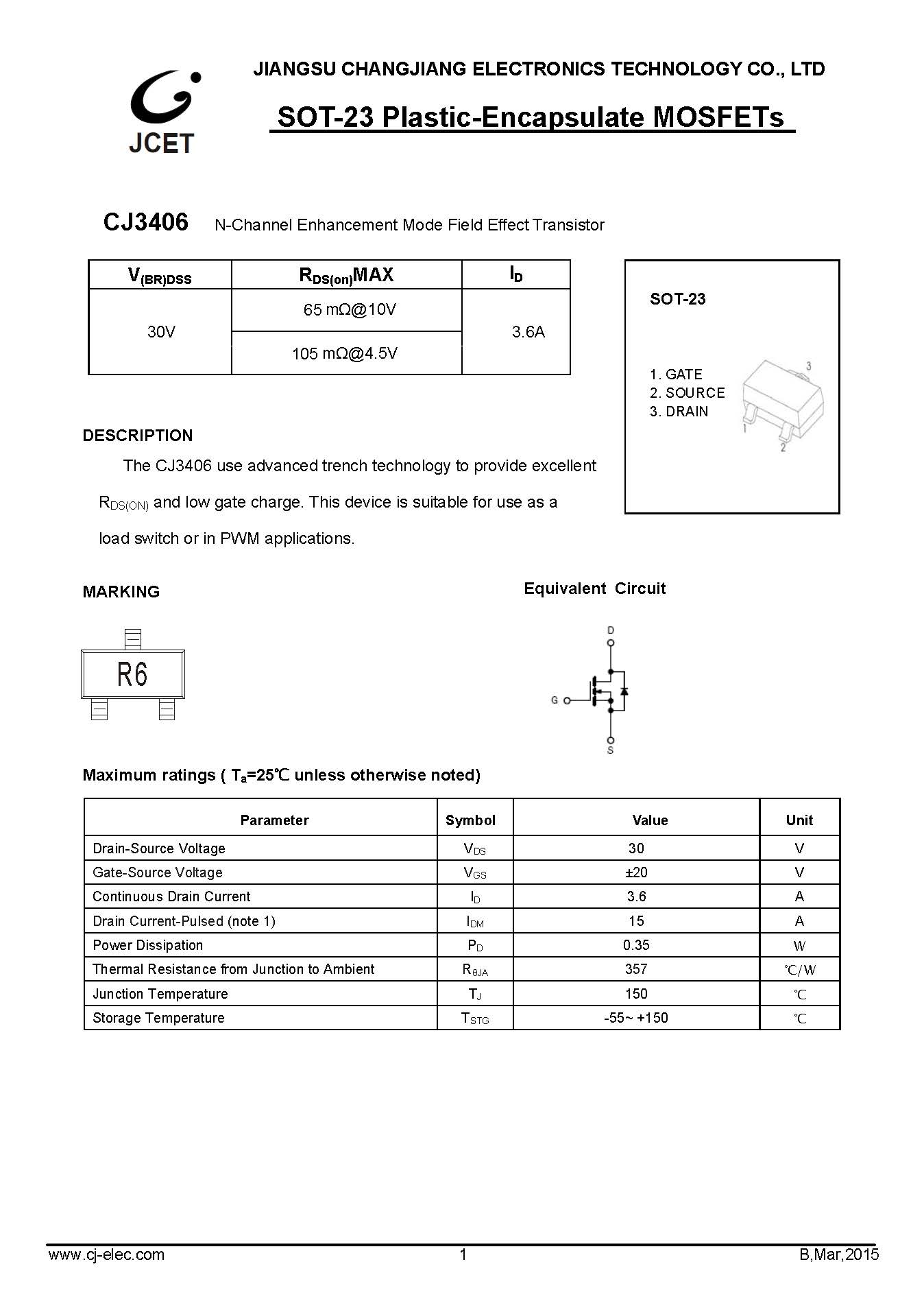 > CJ3406 N-ch MOS管 SOT-23 長電