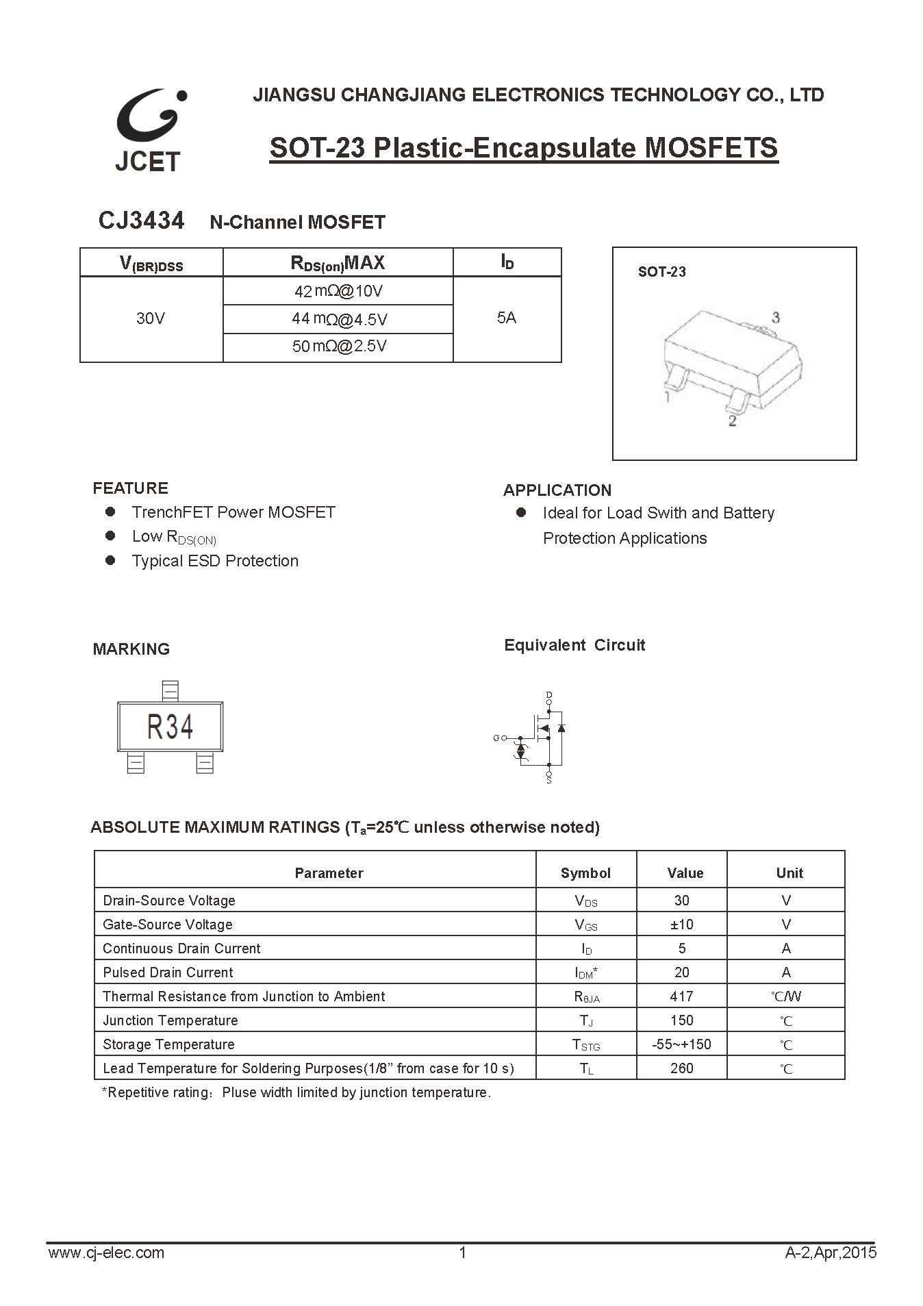 > CJ3434* N-ch MOS管 SOT-23 長電