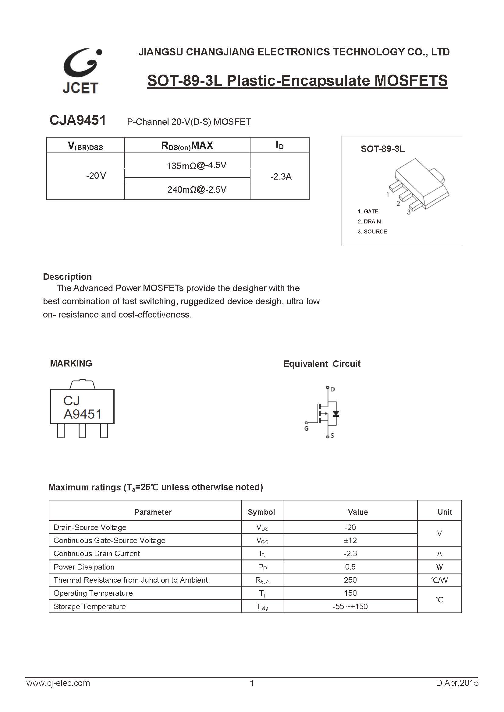 > CJA9451 P-ch MOS管 SOT-89-3L 長電
