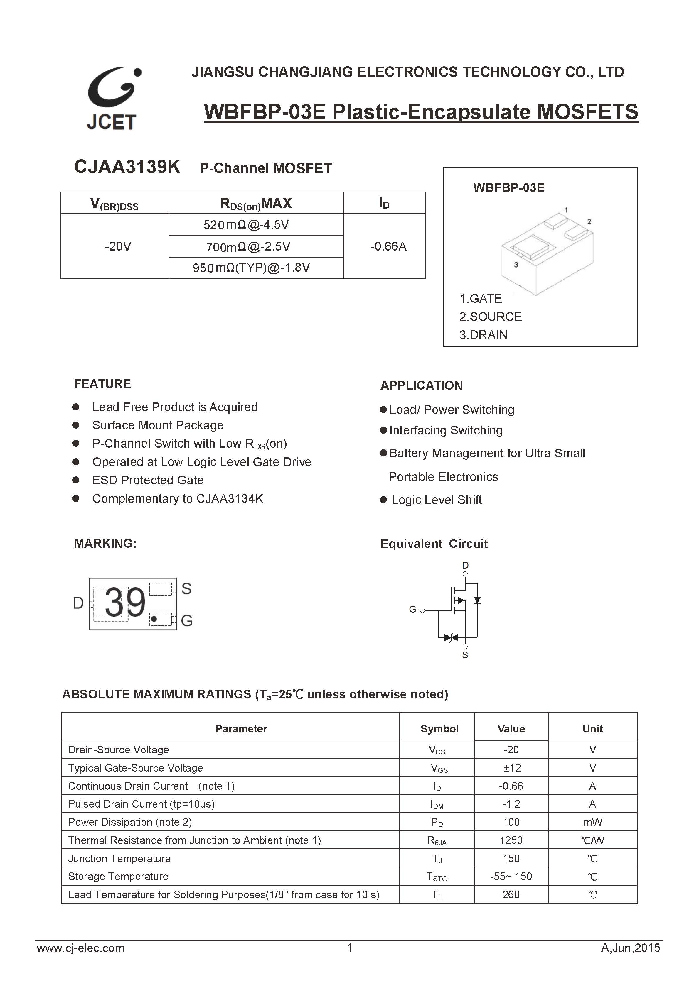 CJAA3139K P-ch MOS管 長(zhǎng)電 SOT-723