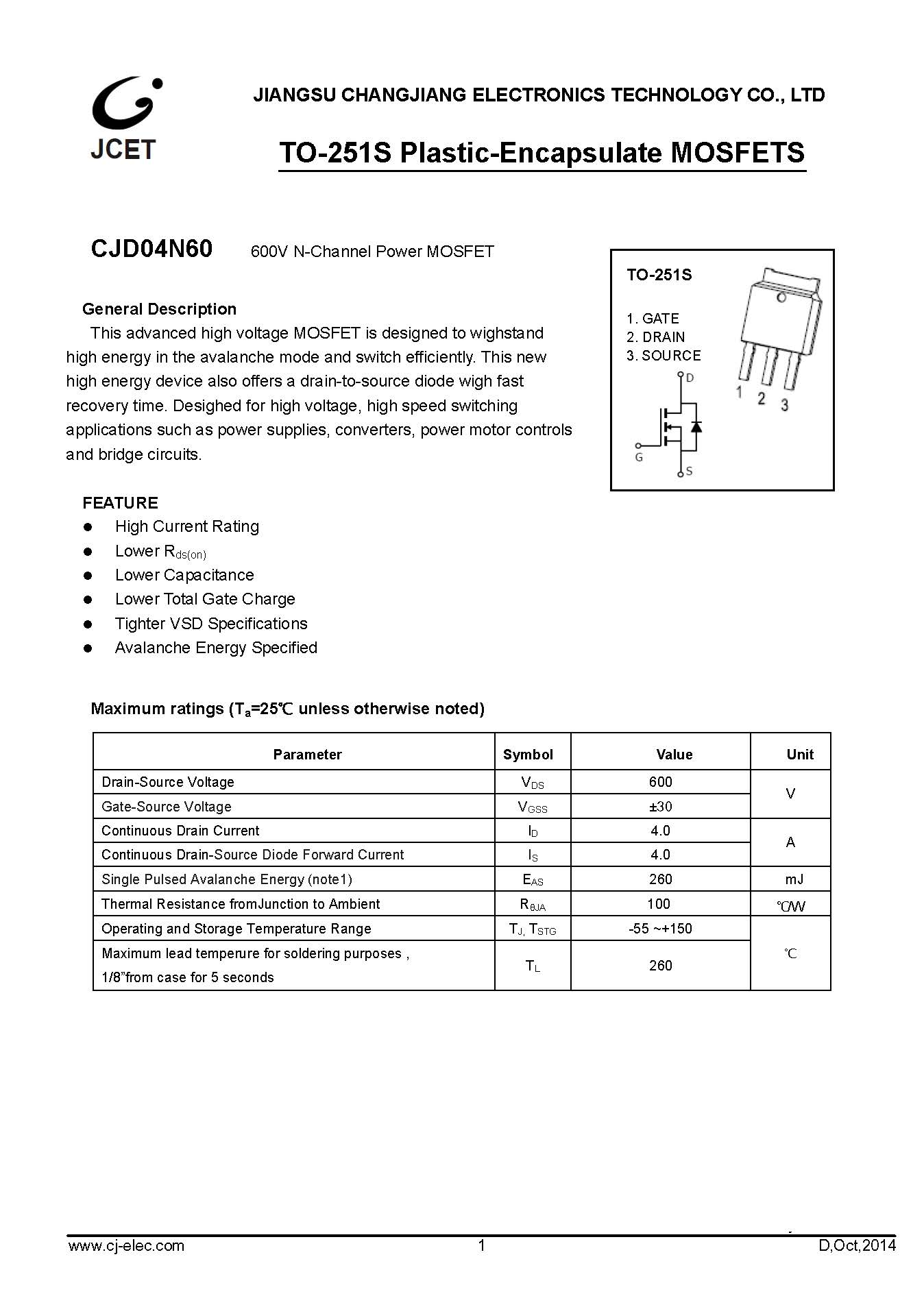 > CJD04N60 N-ch MOS管 TO-251S 長電