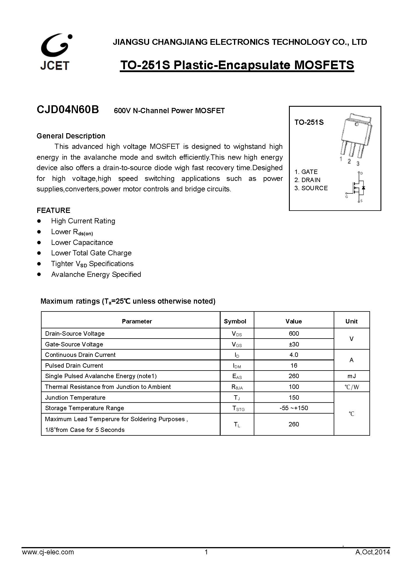 CJD04N60B N-ch MOS管 TO-251S 長電