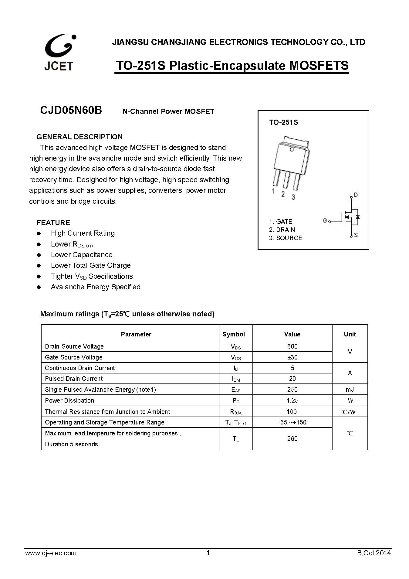CJD05N60B N-ch MOS管 TO-251S 長電