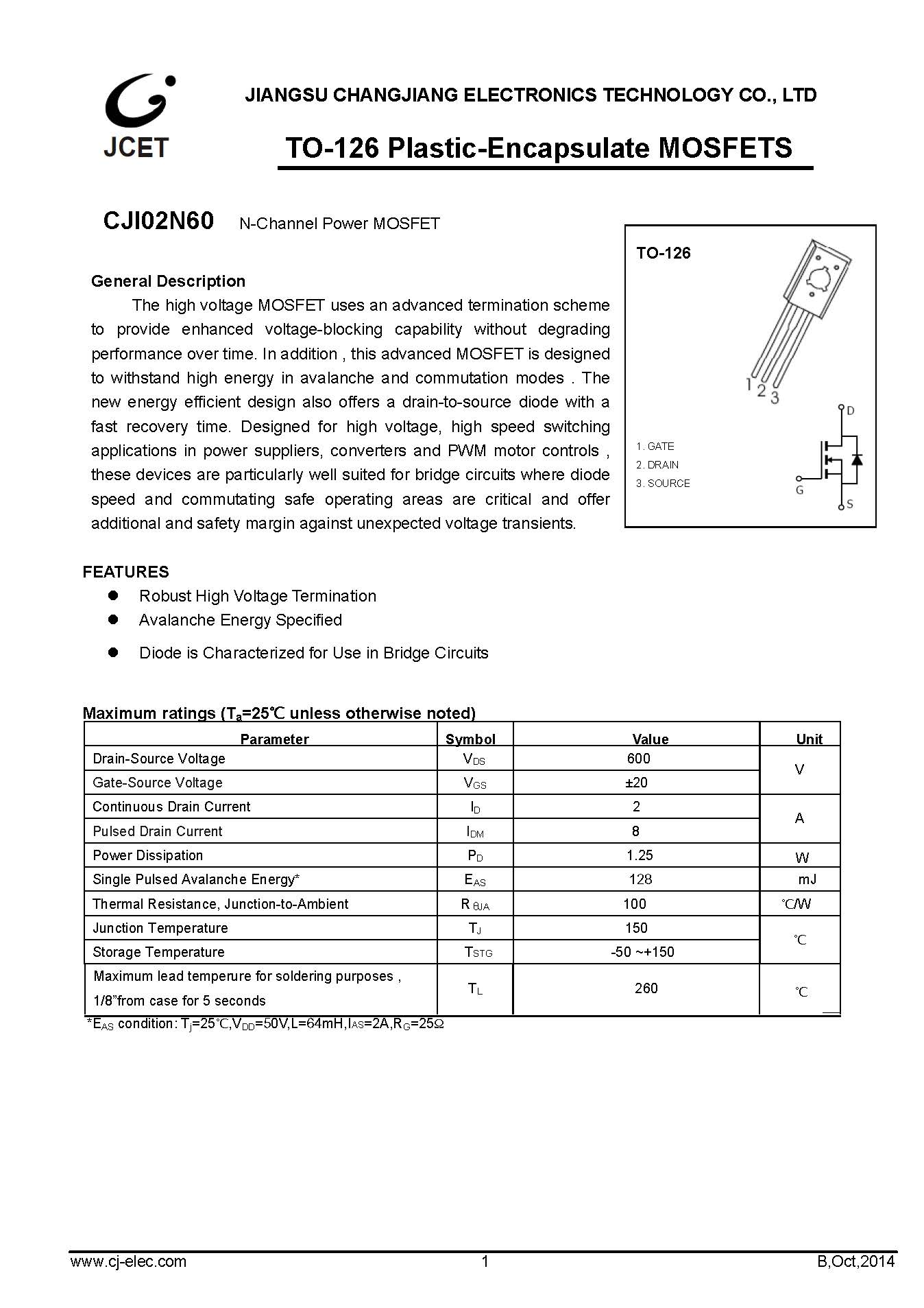 > CJI02N60 N-ch MOS管 TO-126 長電