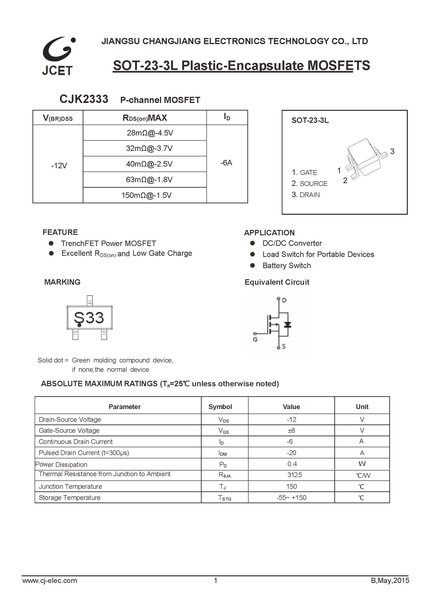 CJK2333 P-ch MOS管 SOT-23-3L(12R) 長(zhǎng)電