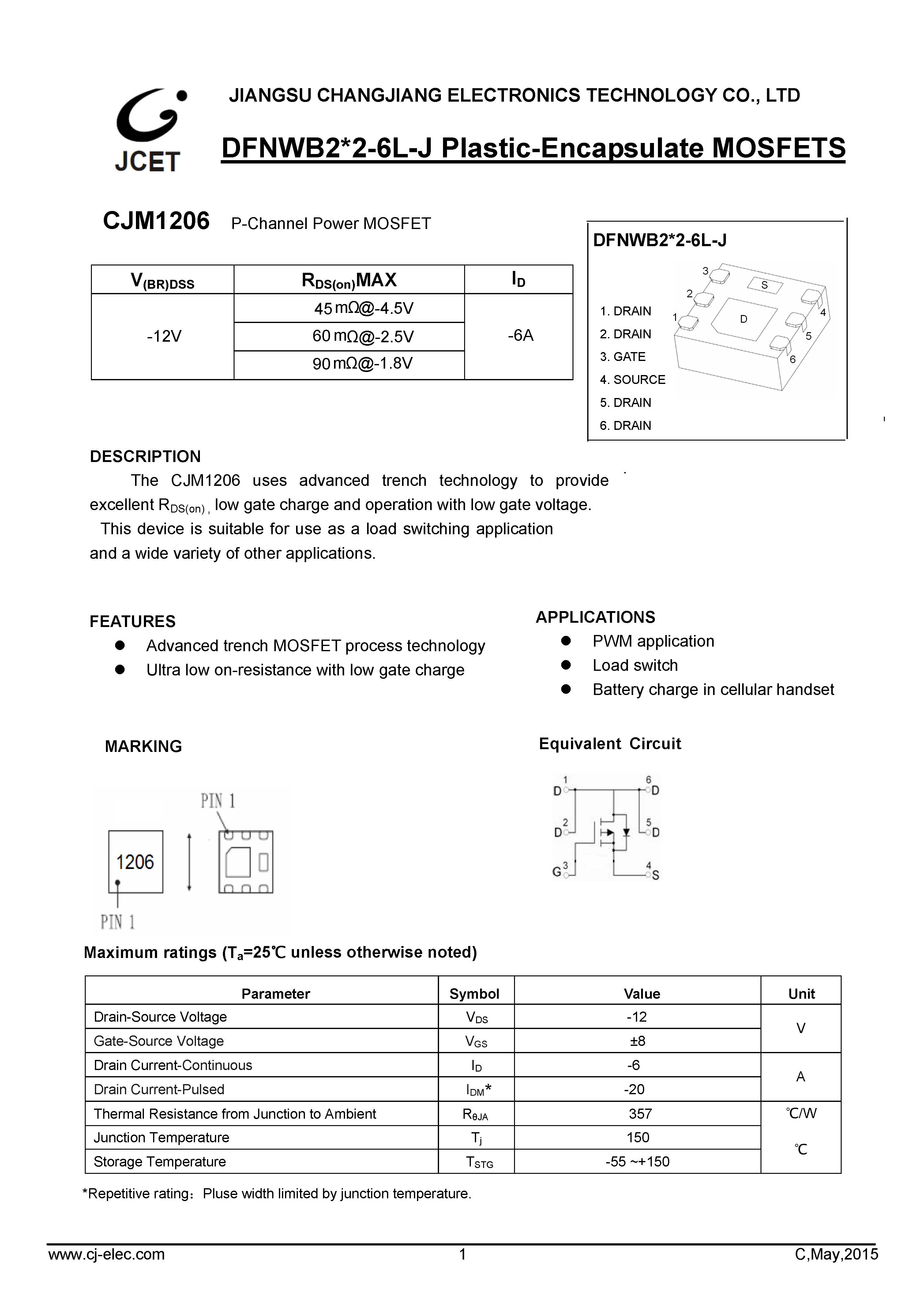 CJM1206 P-ch MOS管 DFNWB2×2-6L-J(P0.65T0.75/0.85) 長(zhǎng)電