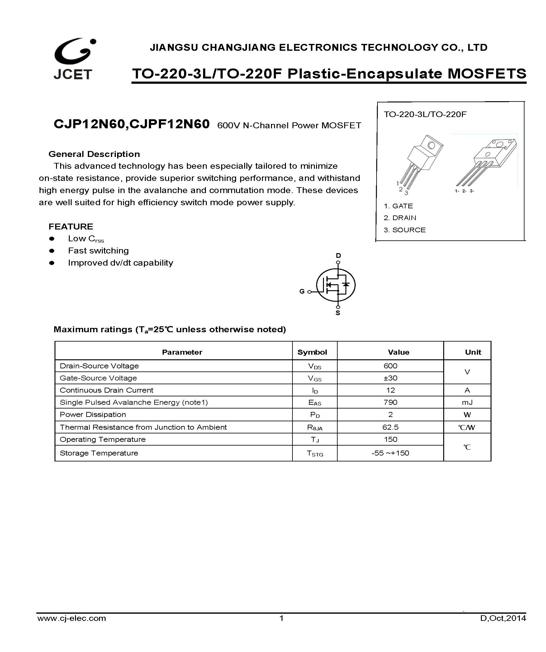CJP12N60 N-ch MOS管 TO-220-3L長電