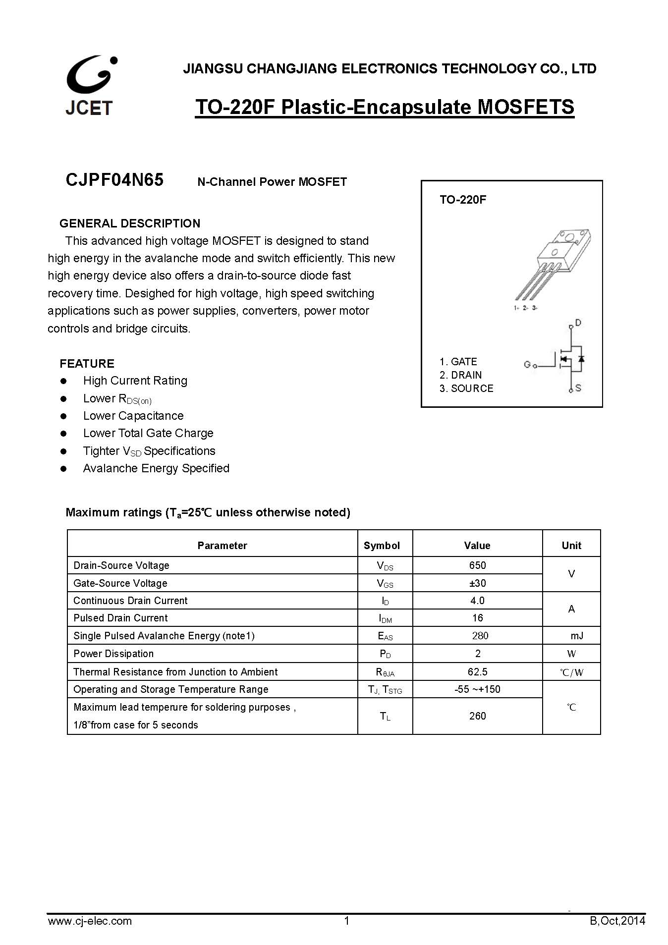 CJPF04N65 N-ch MOS管 TO-220F 長電