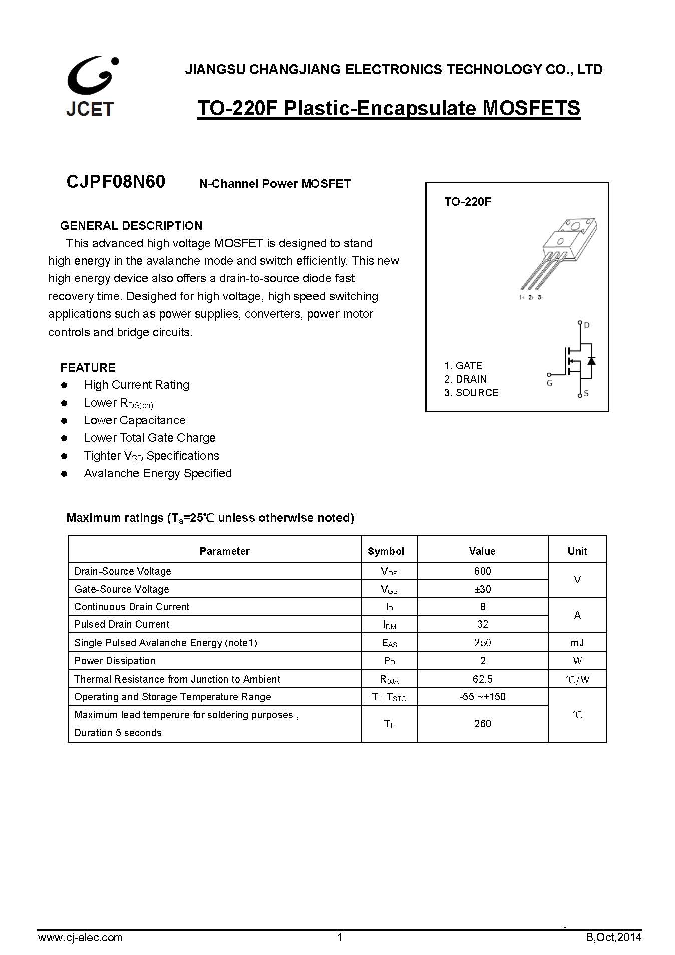 CJPF08N60 N-ch MOS管 TO-220F 長電