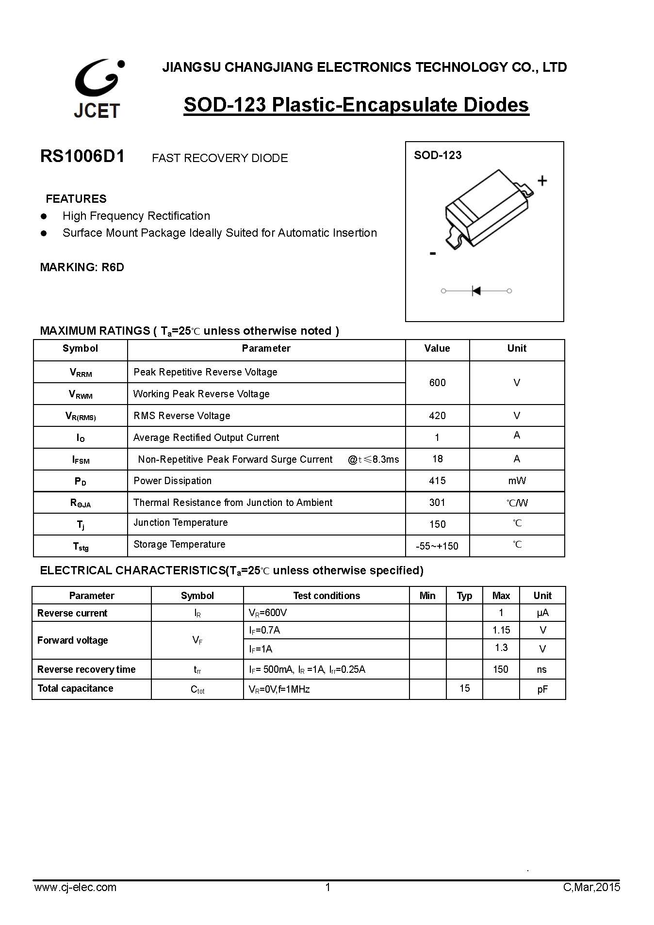 > RS1006D1* 415mw VR 600V SOD-123 長電 快恢復二極管