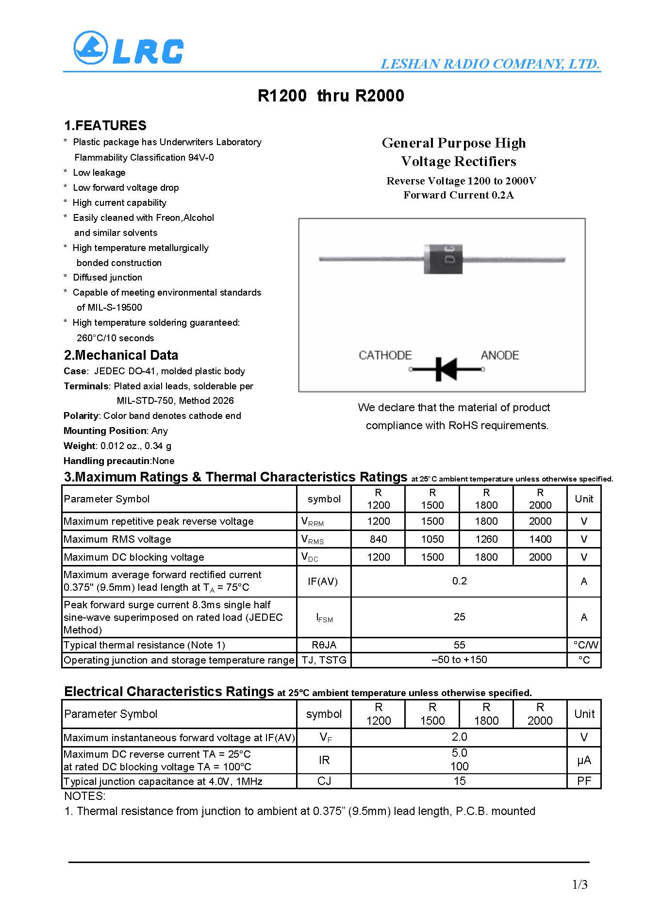 R1200 DO-41 VR 1200V LRC 高壓二極管
