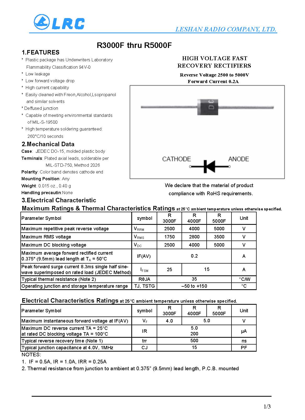 R4000F DO-15 VR 4000V LRC 高壓二極管