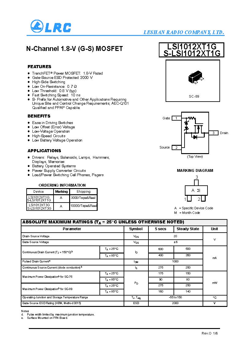 > LSI1012XT1G SC-89 20V N-Channel(with ESD) LRC MOS管