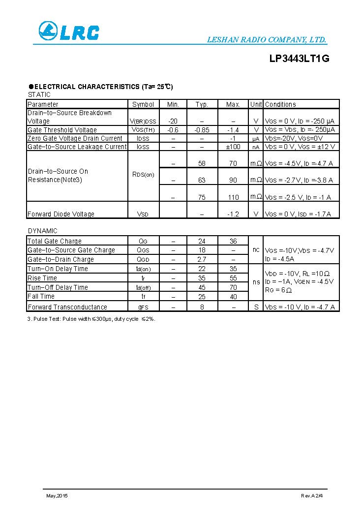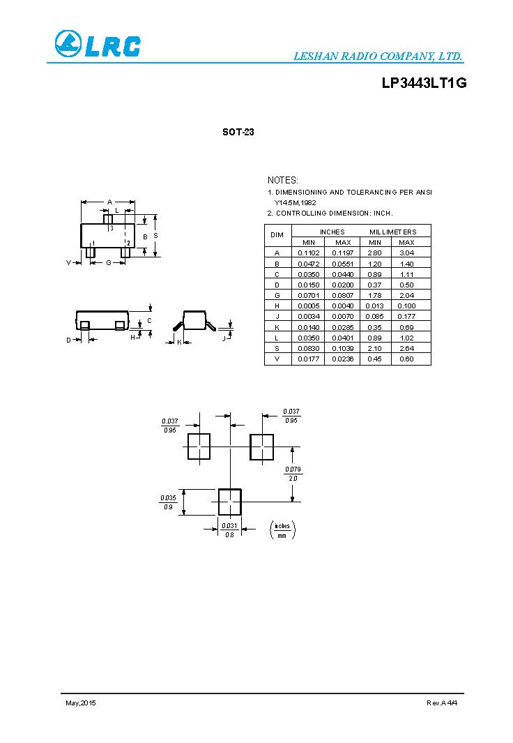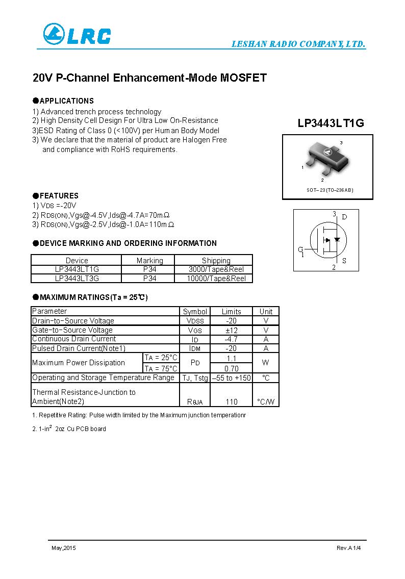 LP3443LT1G SOT-23 20V P-Channel LRC MOS管
