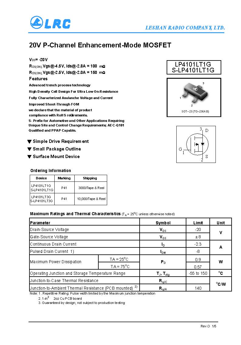> LP4101LT1G SOT-23 20V P-Channel LRC MOS管