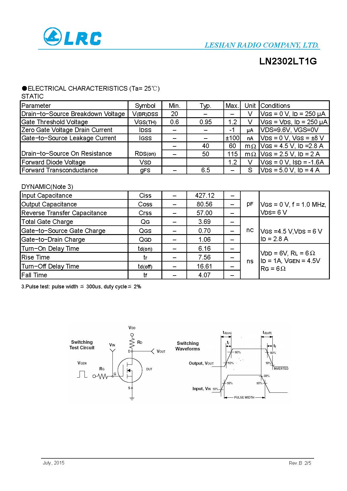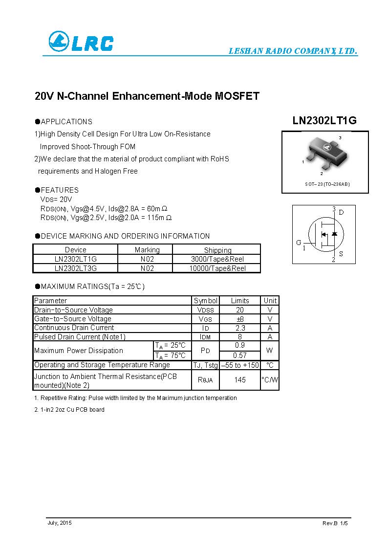 LN2302LT1G SOT-23 20V N-Channel LRC MOS管