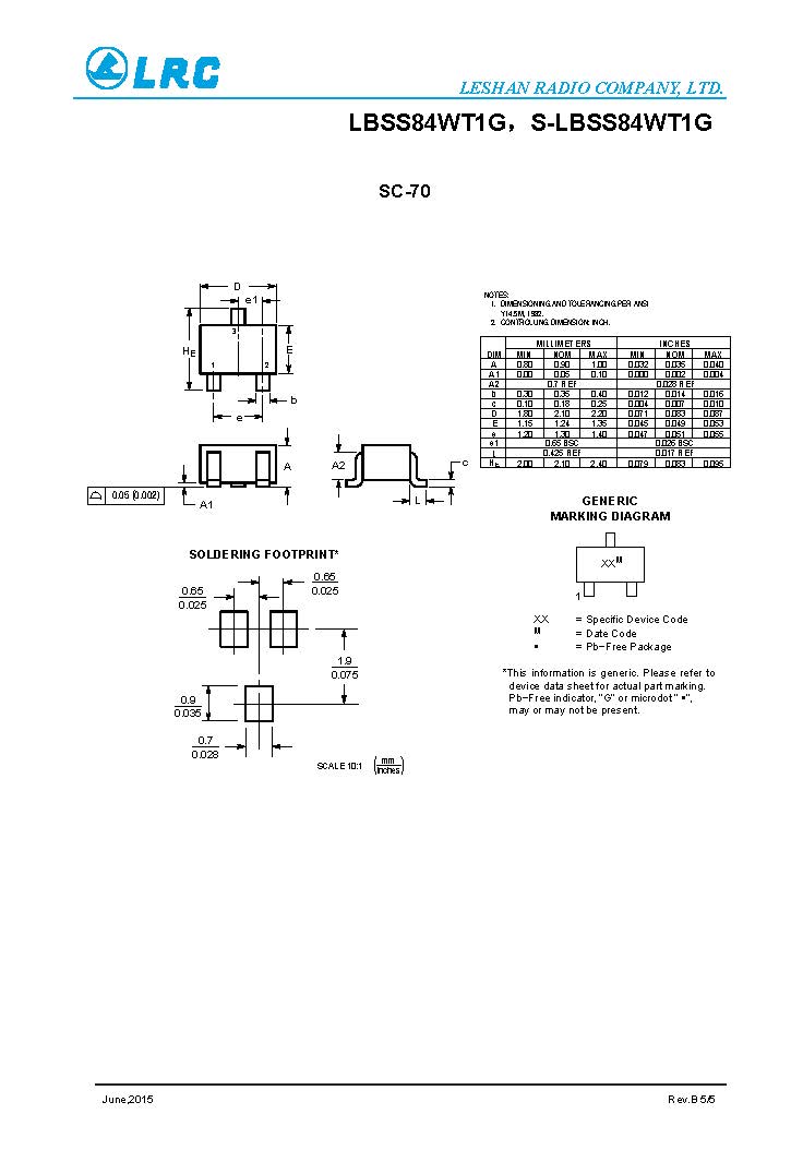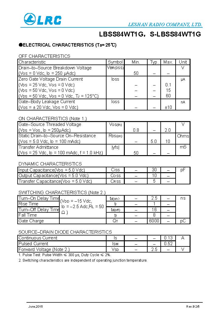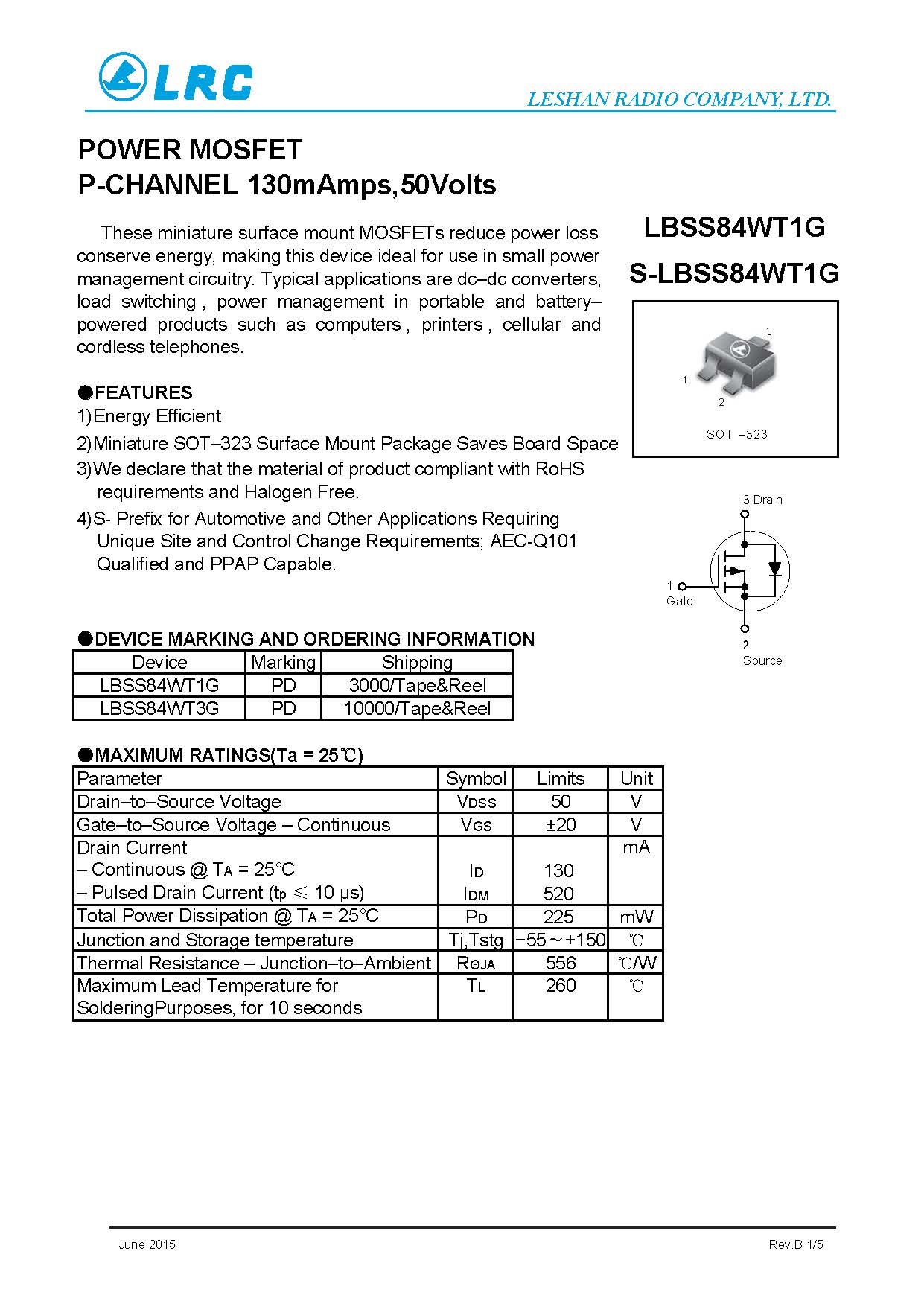 > LBSS84WT1G SC-70 P-Channel 50V LRC MOS管