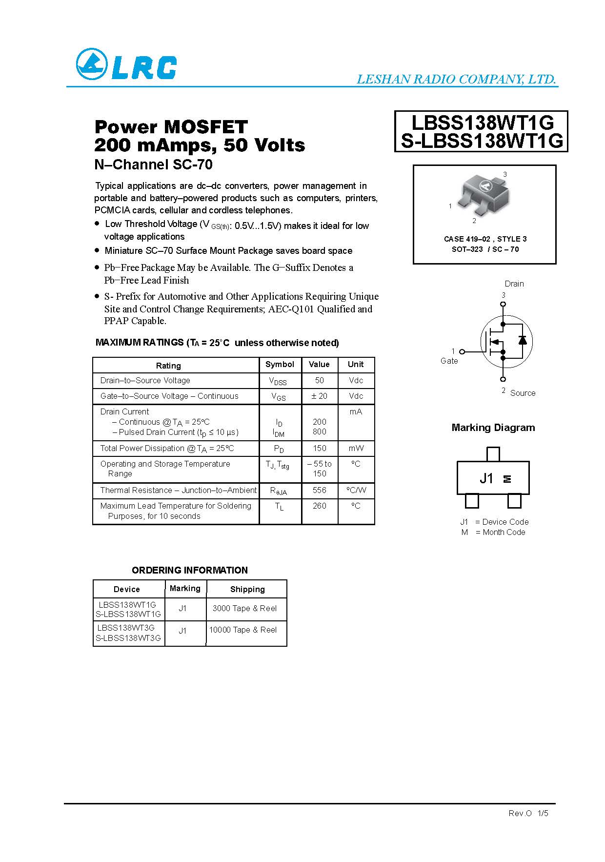 > LBSS138WT1G SC-70 N-Channel 50V LRC MOS管