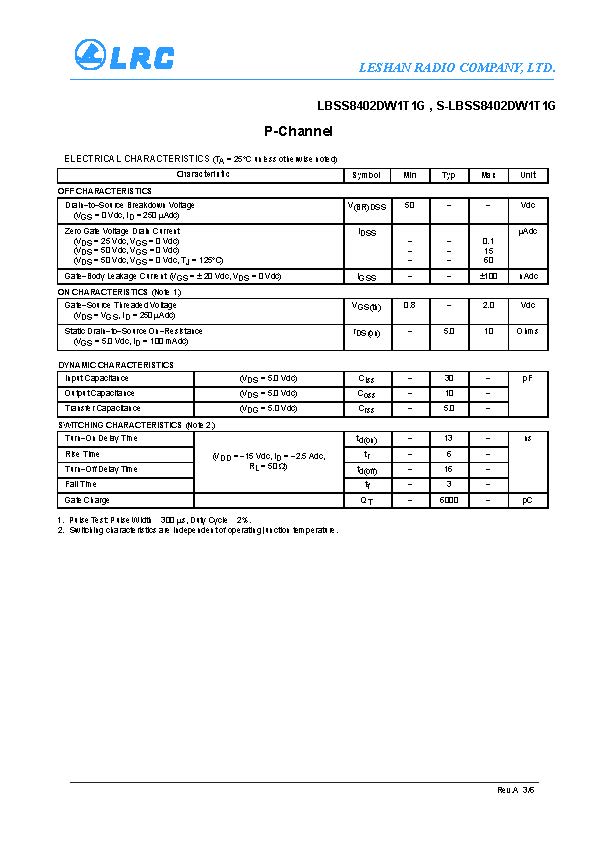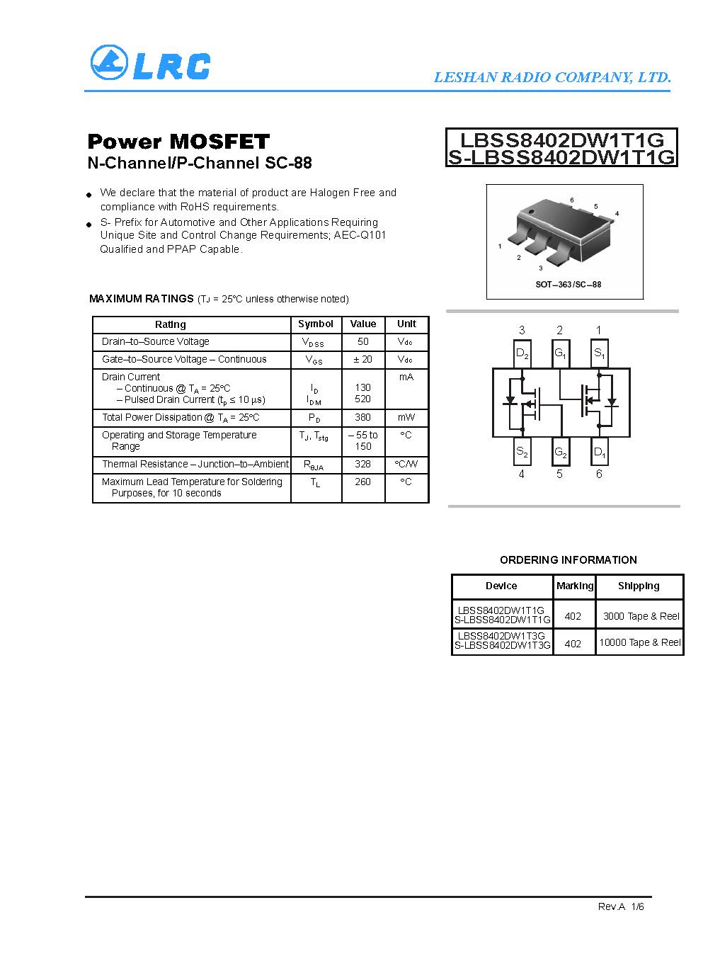 > LBSS8402DW1T1G SC-88 50V N-Channel/P-Channel LRC MOS管