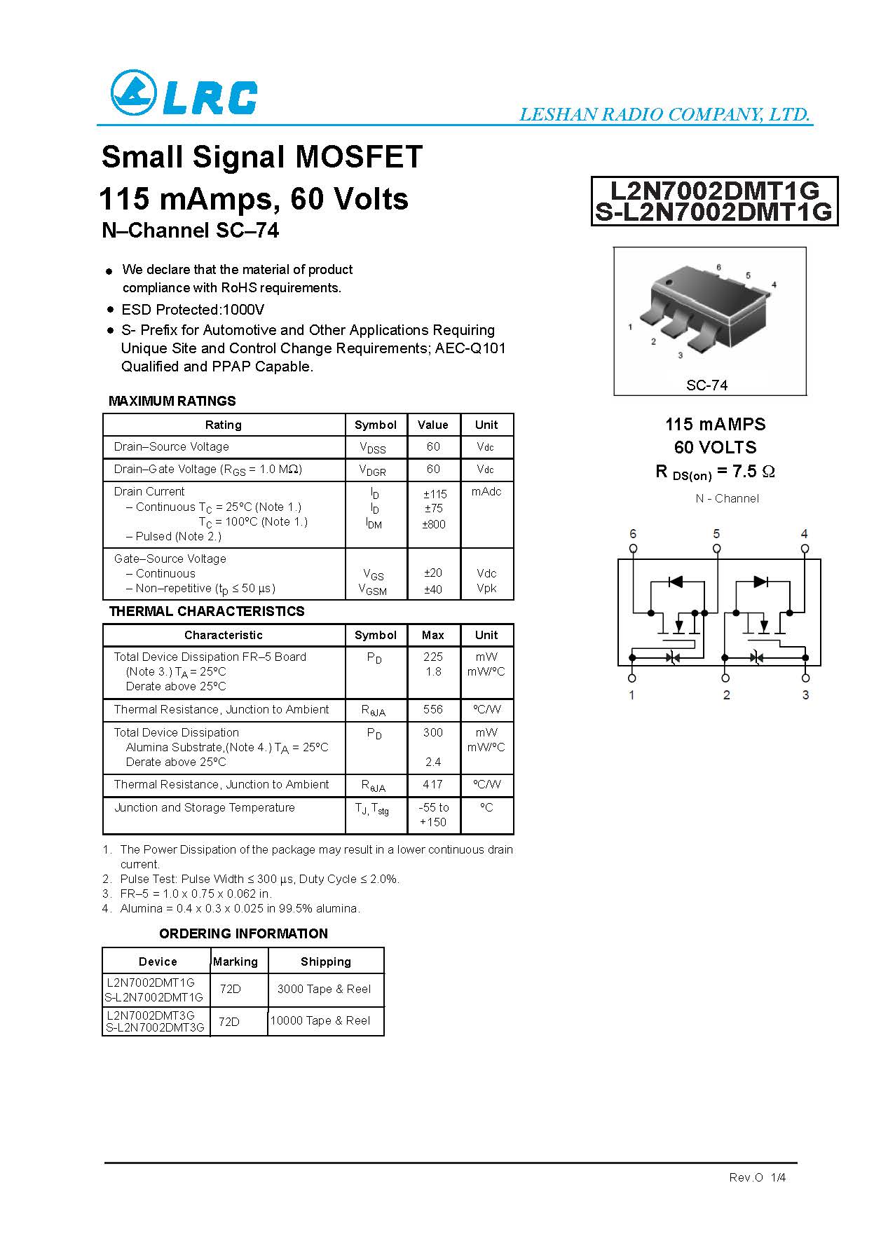 L2N7002DMT1G SC-74 Dual-N-Channel(with ESD) 60V LRC MOS管