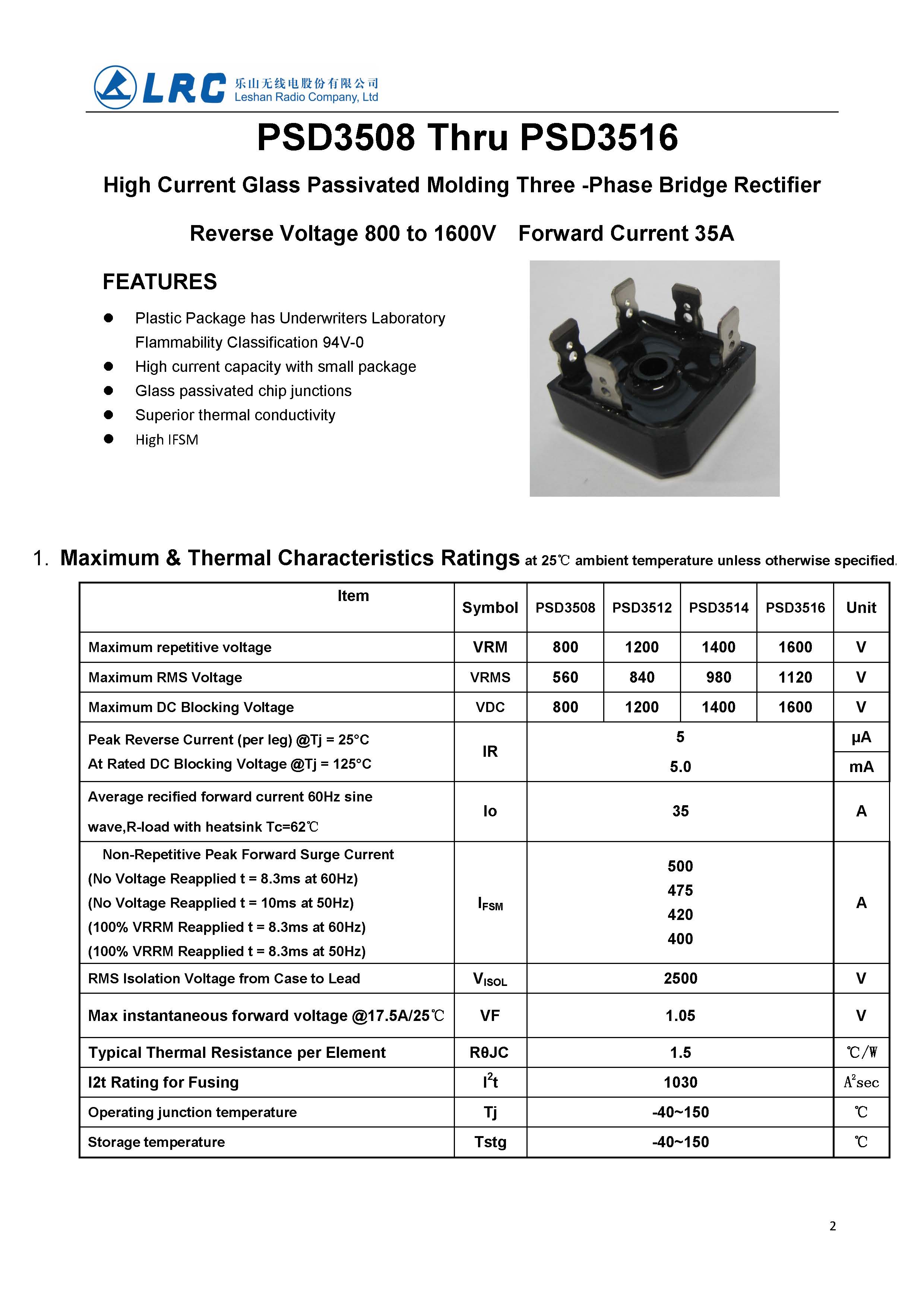 PSD3508 VRRM 800V VF 1.1V IR 10uA LRC 三相整流二極管