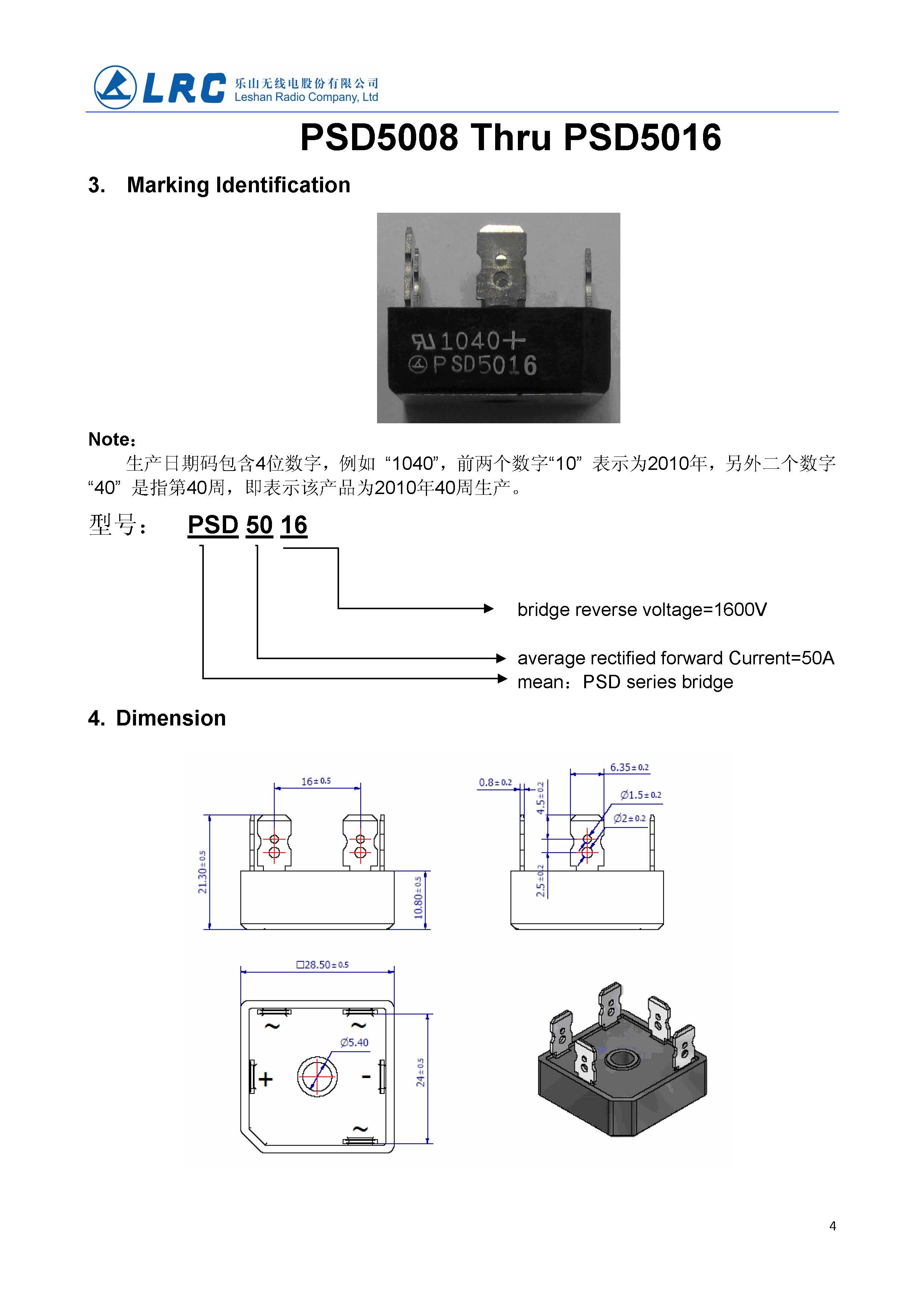 PSD5004 VRRM 400V VF 1.1V IR 10uA LRC 三相整流二極管