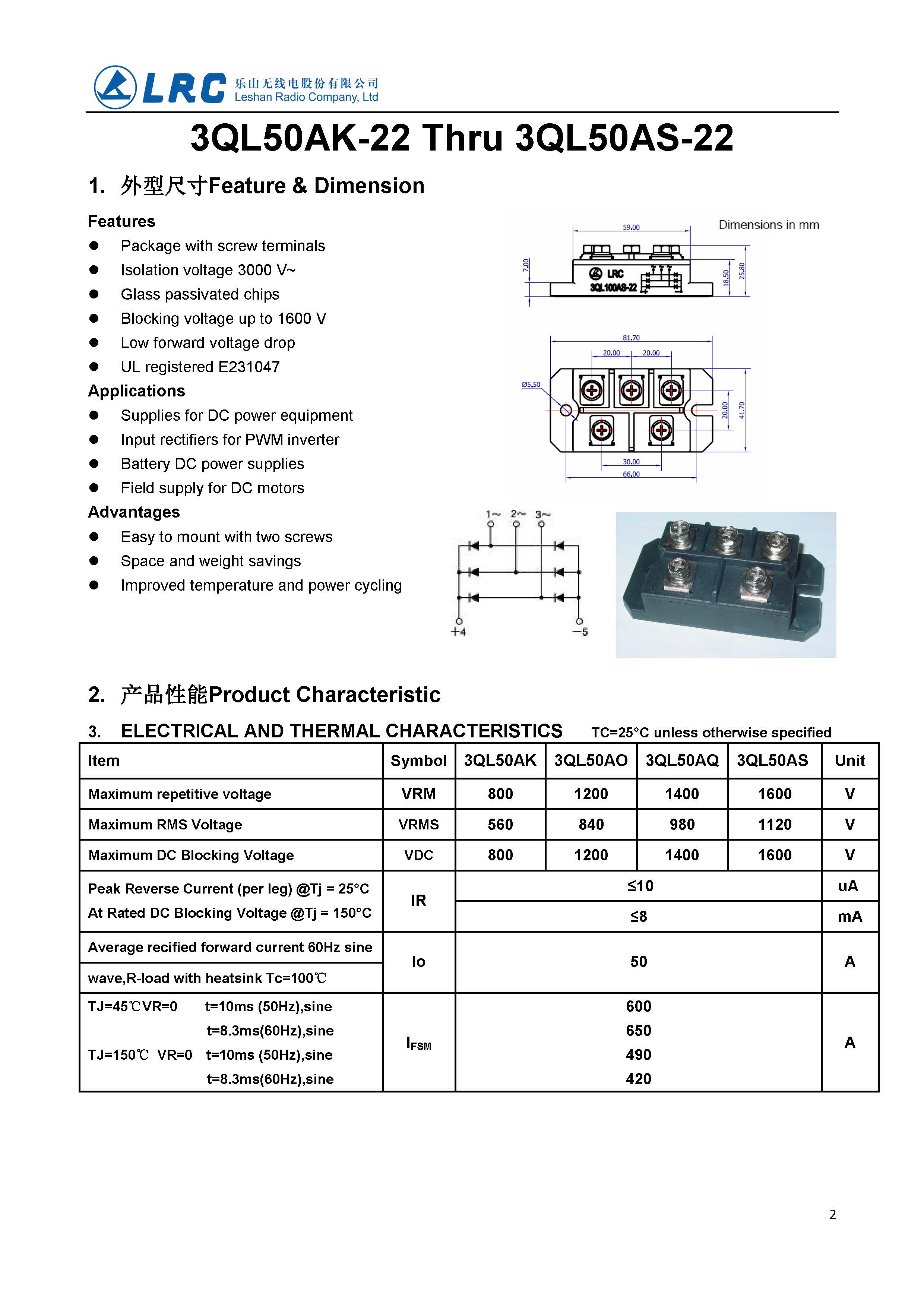 > 3QL50AM-22 3QL-100-22 VRRM 1000V VF 1.2V IR 10uA LRC 三相整流二極管