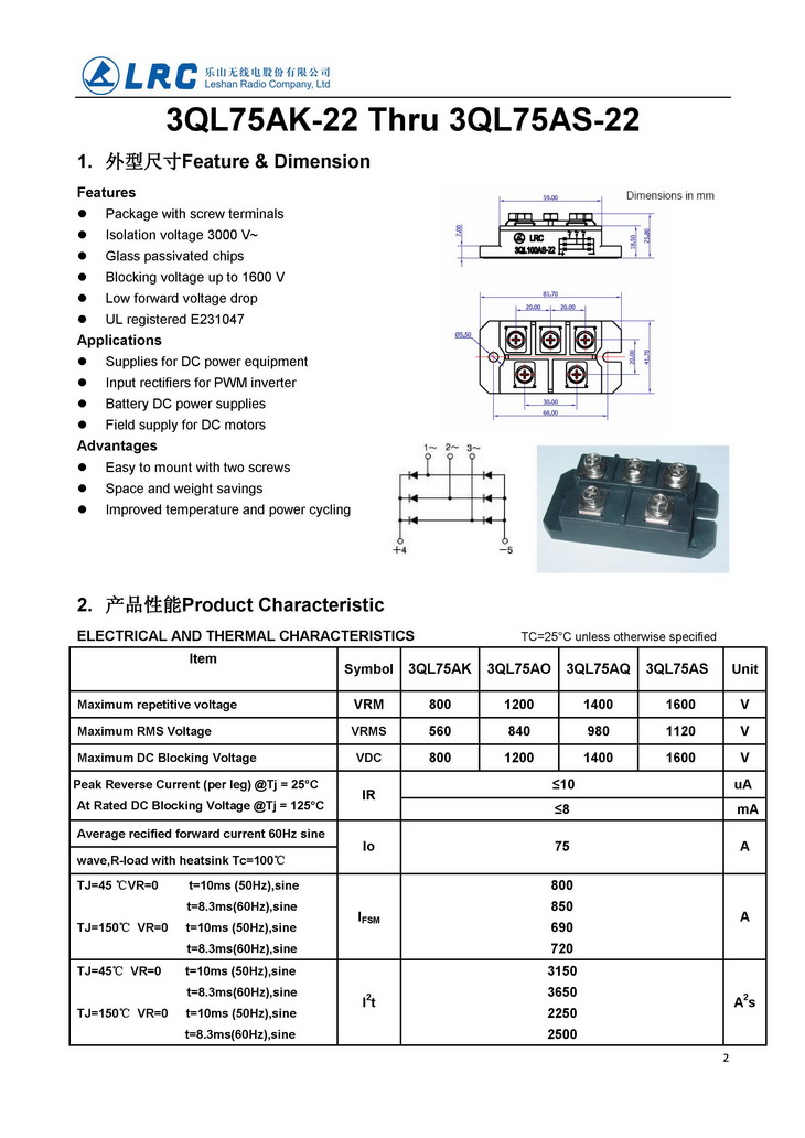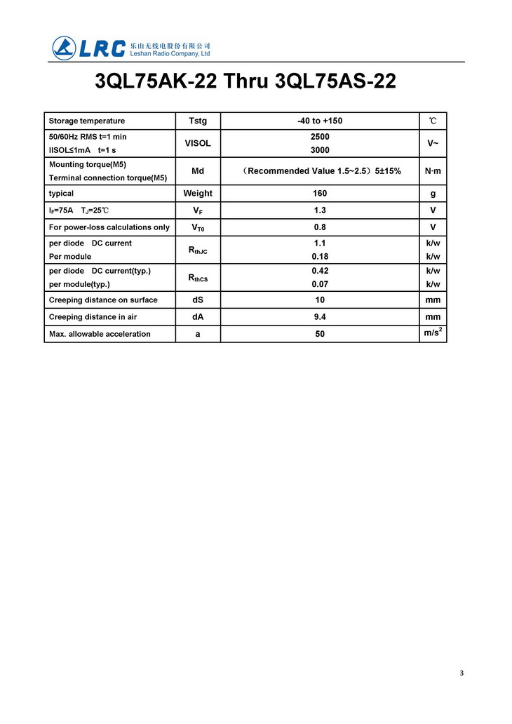 > 3QL75AS-22 3QL-100-22 VRRM 1600V VF 1.2V IR 10uA LRC 三相整流二極管