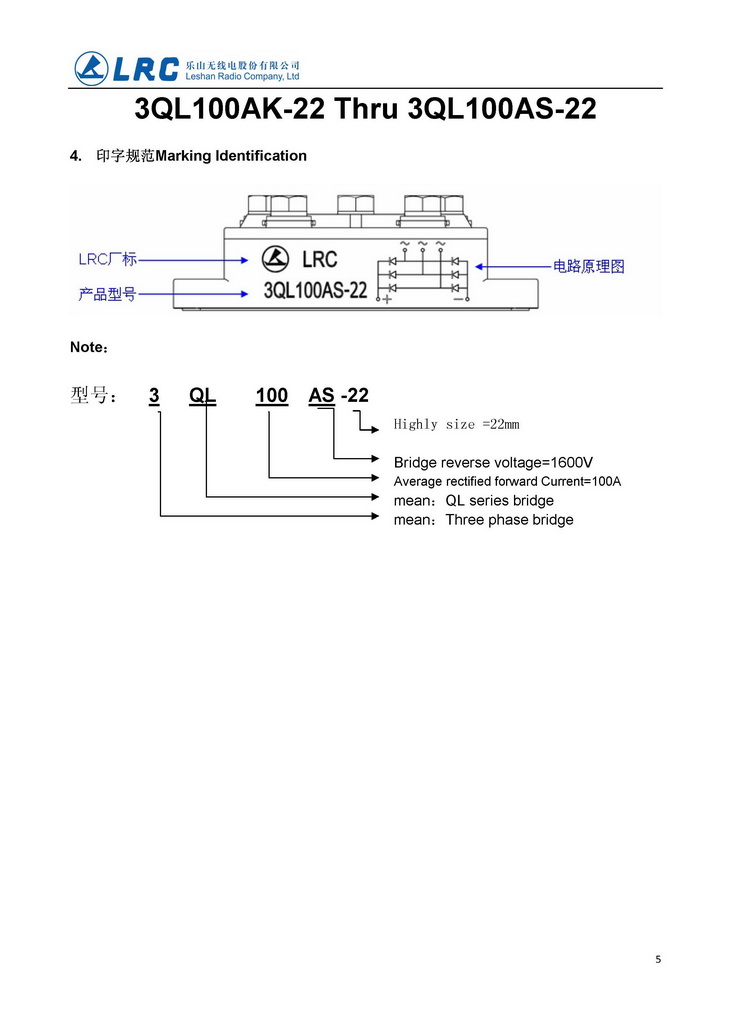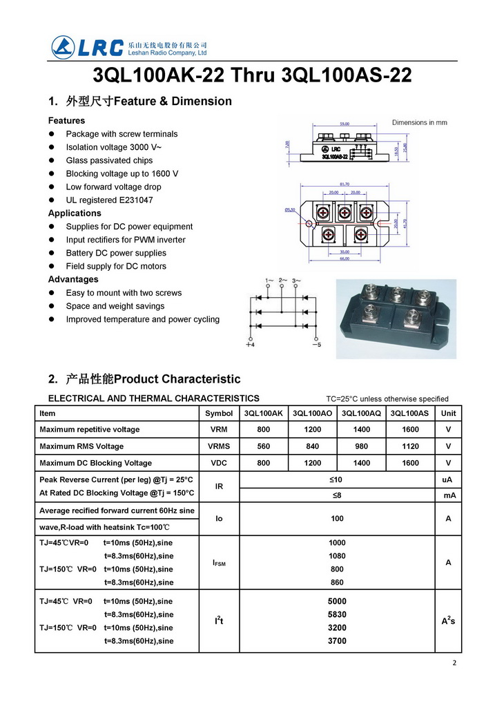 > 3QL100AS-22 3QL-100-22 VRRM 1600V VF 1.2V IR 10uA LRC 三相整流二極管