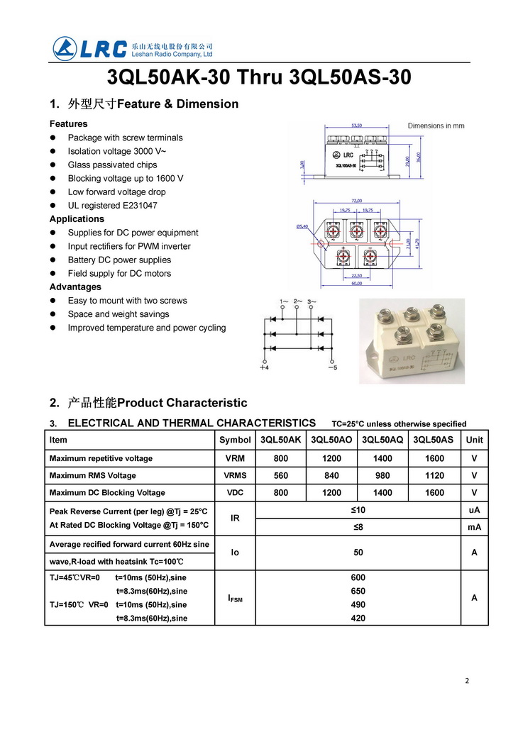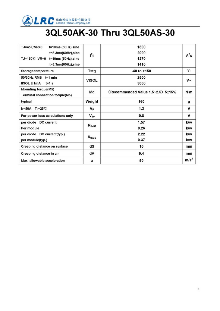 > 3QL50AK-30 3QL-100-30 VRRM 800V VF 1.2V IR 10uA LRC 三相整流二極管