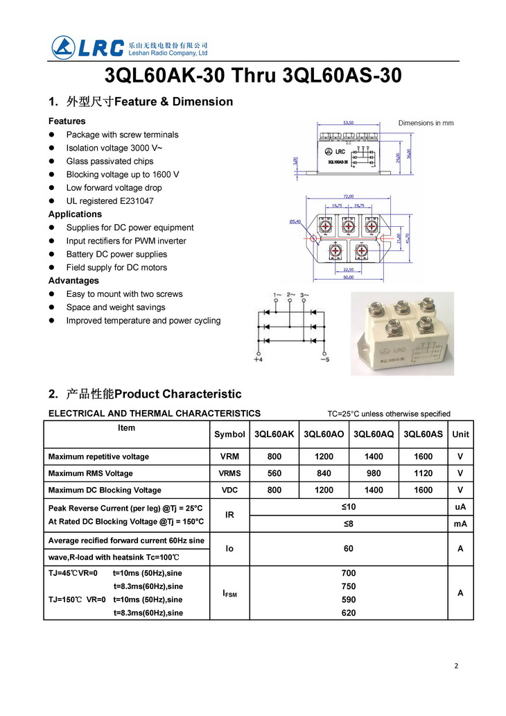 > 3QL60AO-30 3QL-100-30 VRRM 1200V VF 1.2V IR 10uA LRC 三相整流二極管