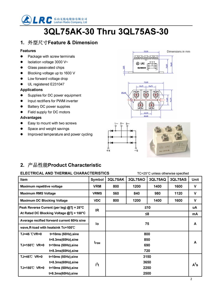 3QL75AS-30 3QL-100-30 VRRM 1600V VF 1.2V IR 10uA LRC 三相整流二極管