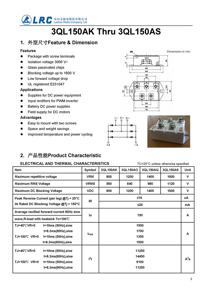 3QL150AS 3QL-200 VRRM 1600V VF 1.2V IR 10uA LRC 三相整流二極管