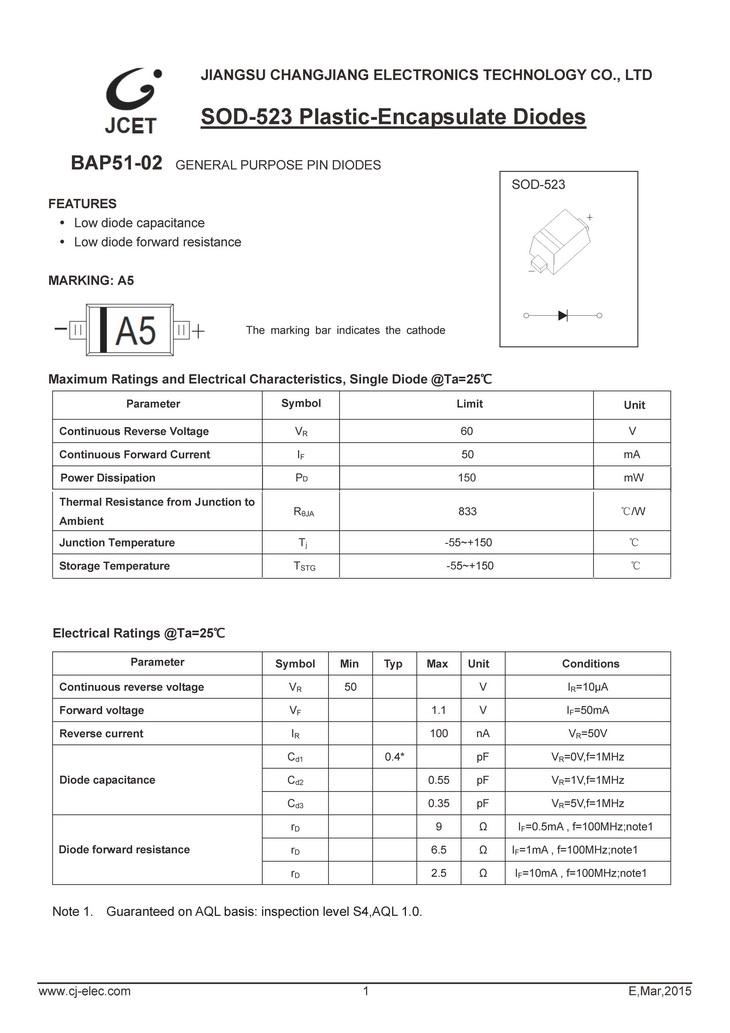 BAP51-02 150mW IF50mA VR50V SOD-523 長(zhǎng)電Pin二極管