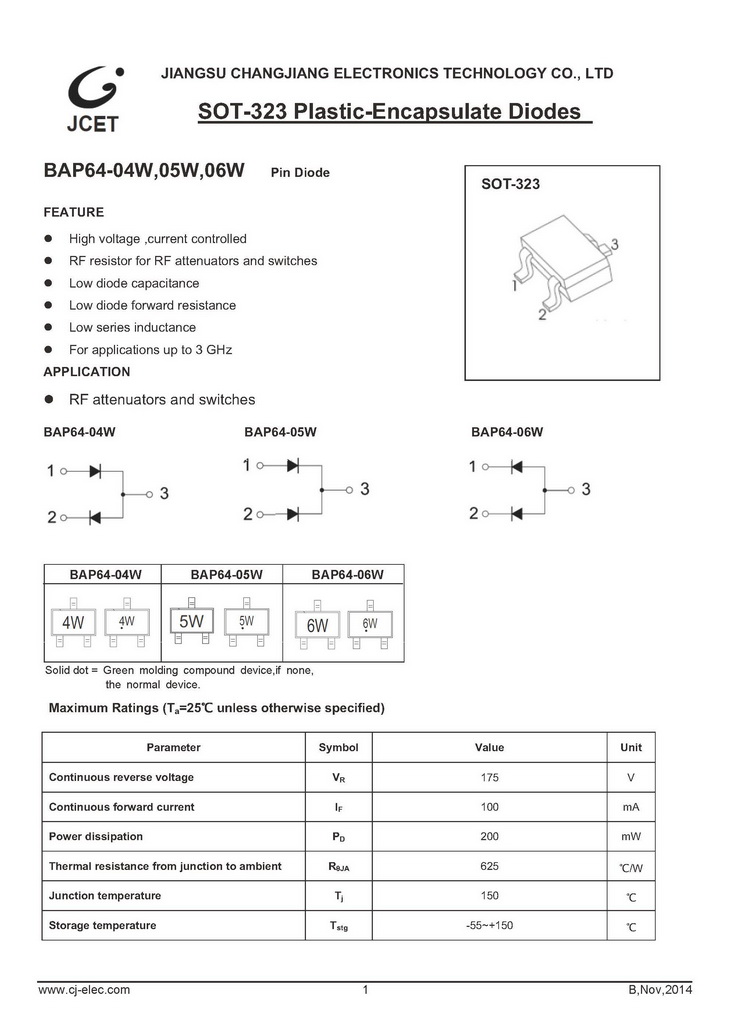 BAP64-04W 200mW IF100mA VR175V SOT-323 長電Pin二極管