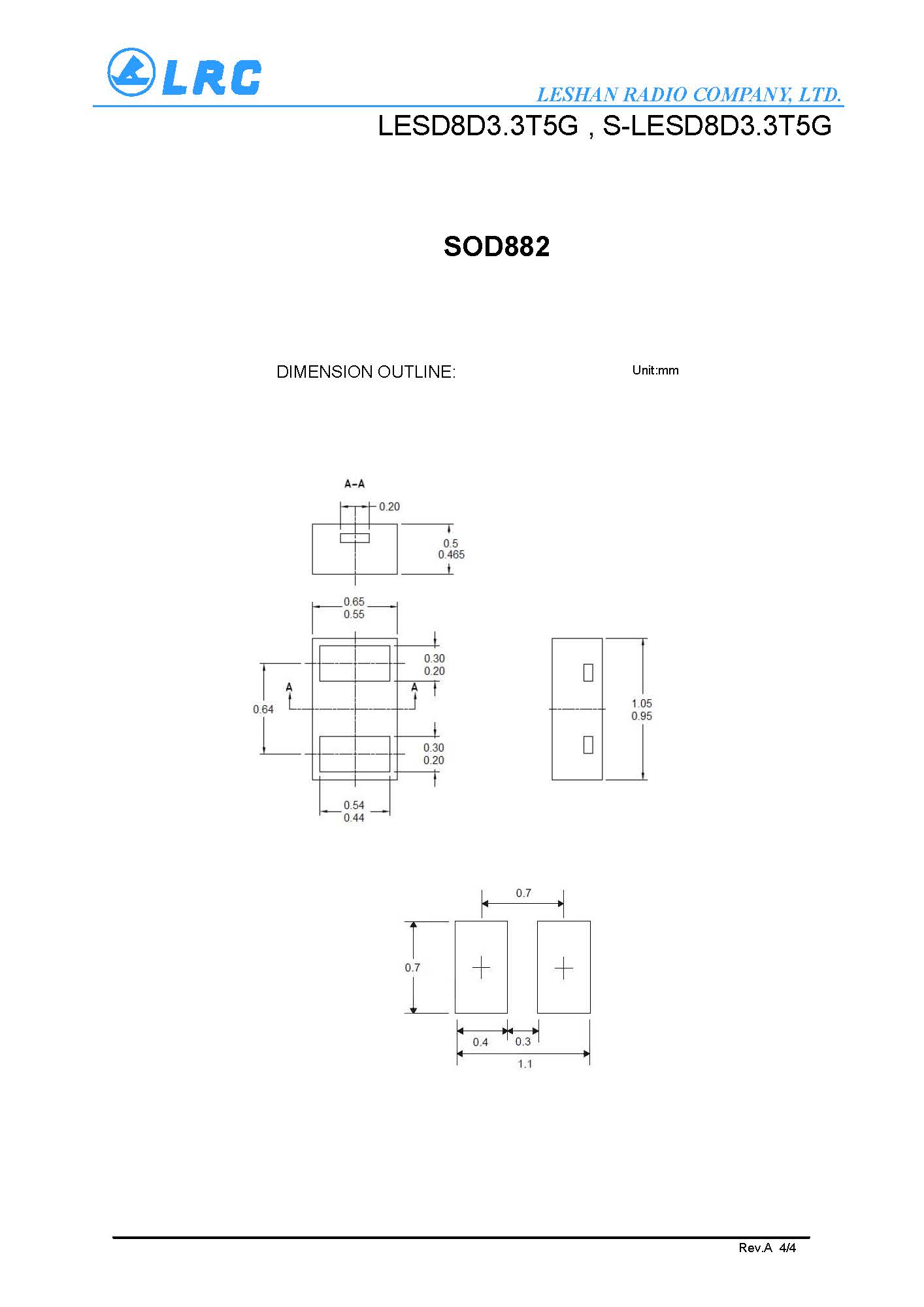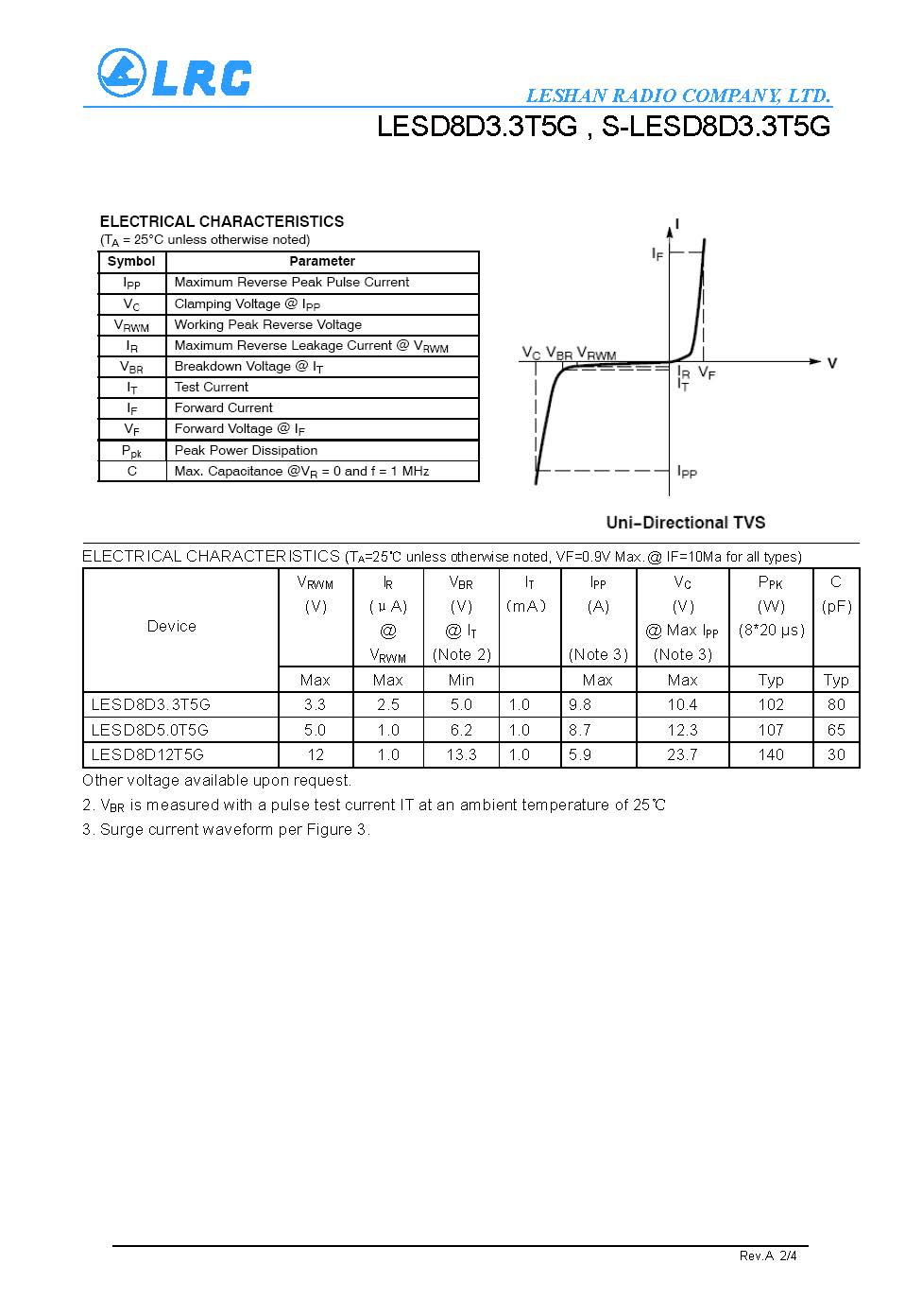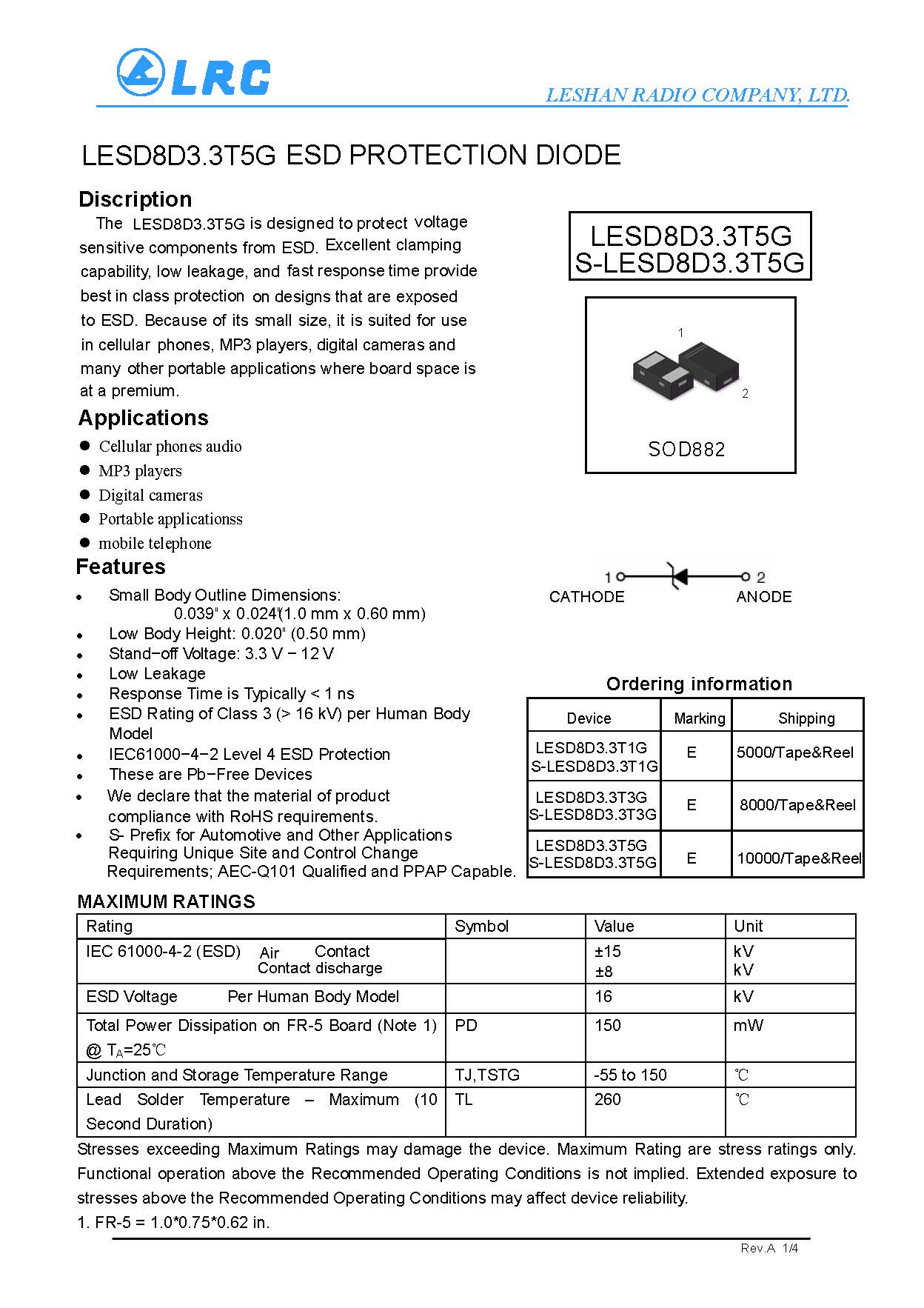 > LESD8D3.3T5G VRM 3.3V VC 12.3V CJ 80pF SOD-882 LRC通用ESD保護二極管
