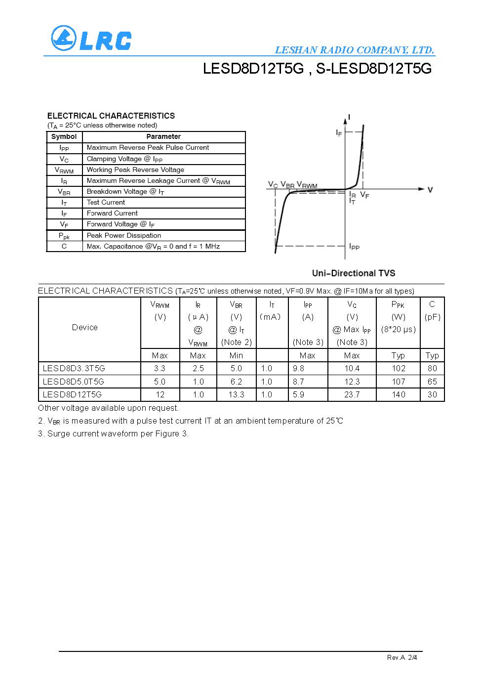 LESD8D12T5G VRM 12V VC 23.7V CJ 30pF SOD-882 LRC通用ESD保護二極管