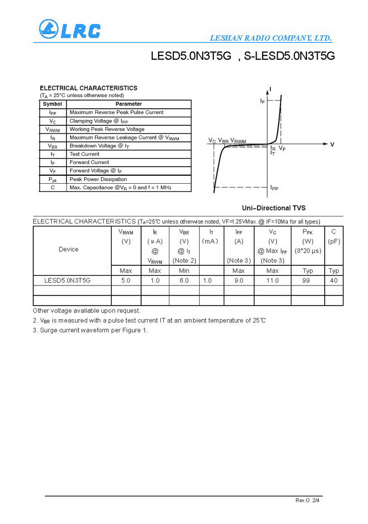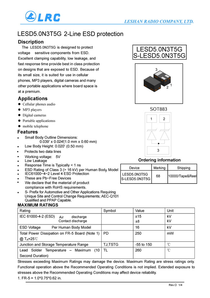 LESD5.0N3T5G VRM 5V VC 11V CJ 40pF SOT-883 LRC通用ESD保護(hù)二極管