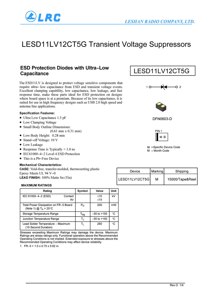 LESD11LV12CT5G VRM 5V VC 12.5V CJ 15pF DFN0603-D LRC通用ESD保護(hù)二極管