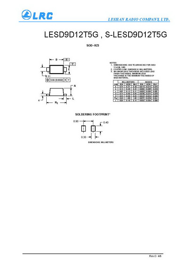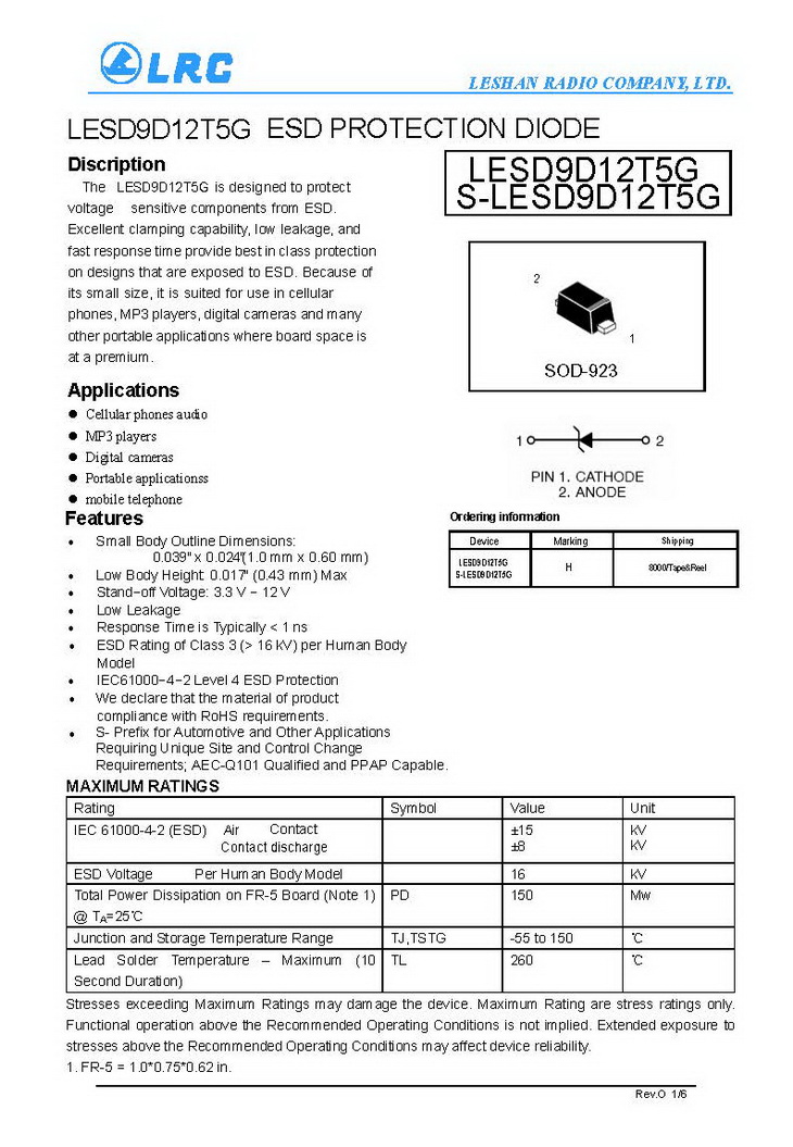 > LESD9D12T5G VRM 12V VC 23.7V CJ 30pF SOD-923 LRC通用ESD保護二極管